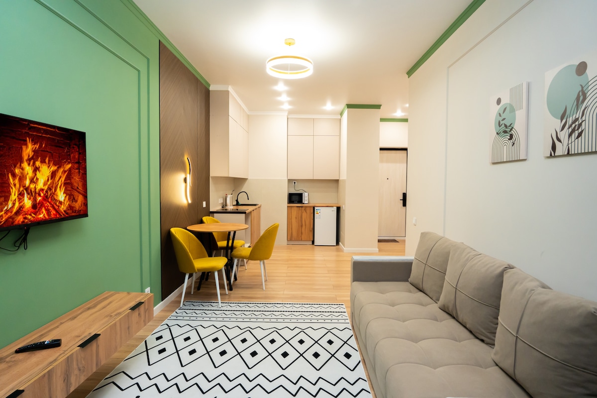 Uusi ja erittäin kodikas huoneisto Almatyn keskustassa, vain muutaman minuutin päässä Mega Park -ostoskeskuksesta. Huoneisto on valoisa, puhdas ja täysin varusteltu: siellä on keittiö, jossa on astiat, mikroaaltouuni, vedenkeitin ja ruokailuvälineet, TV, nopea Wi-Fi, hiustenkuivaaja, silitysrauta, kuivain ja tarvittavat kylpyhuonetarvikkeet. Talossa on kuntosali ja supermarketti. Sopii erinomaisesti rentoutumiseen, liikematkoihin ja mukavaan majoittumiseen kaupungissa 🌿