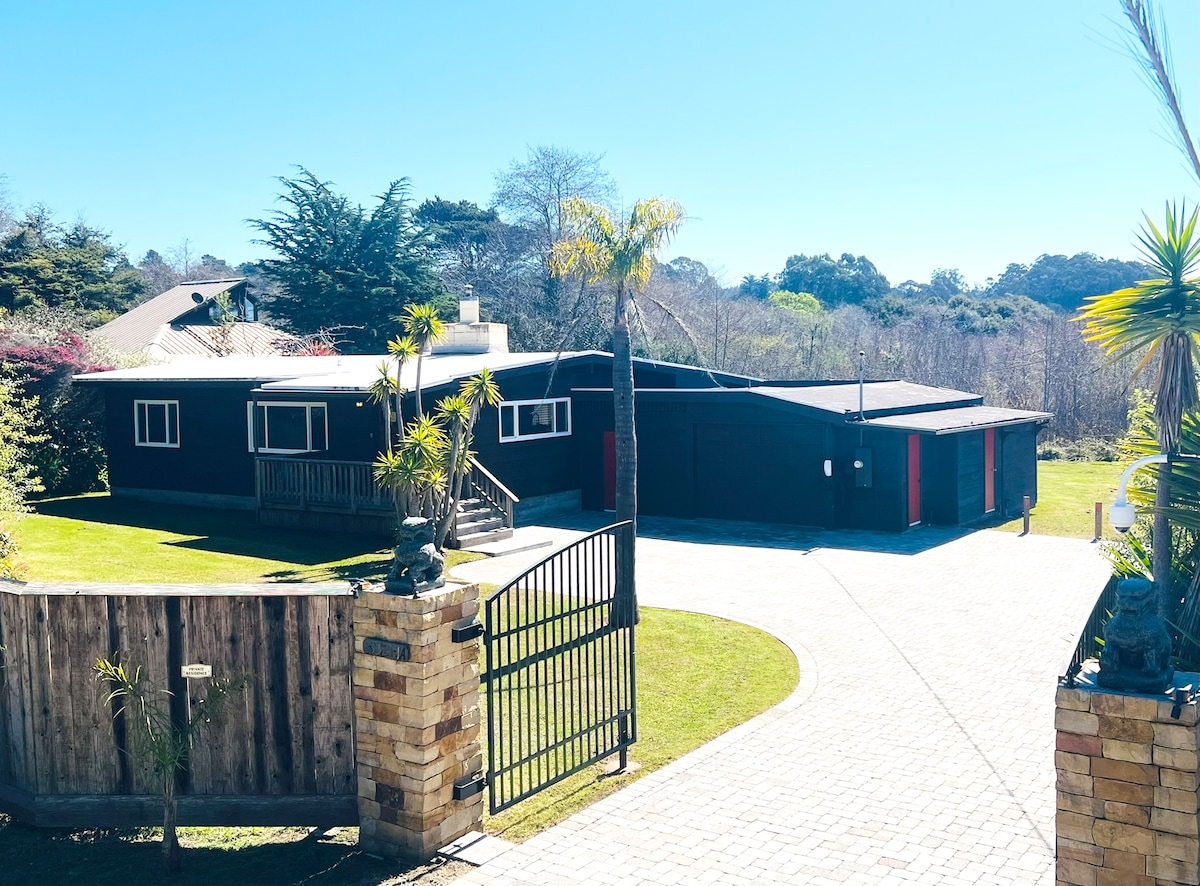 Arkkitehtonisesti upea! Sijaitsee hiljaisissa, kauniissa, rauhallisissa puutarhoissa, joissa on suuri lammikko. Upeat mittatilaustyönä valmistetut huonekalut, stereo, kylpylätyylinen lasiharkkosuihku. Kylpylävaatteita saatavilla. Säteilylämpö. Yksi makuuhuone parvekkeella, yksi alakerrassa. Lyhyt kävelymatka dyyneillä autiolle Ten Mile Beachille. Koska pääsy on rajoitettua, ranta on käytännössä tyhjä - rannikon salaisuus. Asun kiinteistössä kultaisen noutajani ja kissani kanssa (ei sallittu mökissä), mutta sisäänkirjautumisen jälkeen haluan yksityisyyttä yhtä paljon kuin sinä.