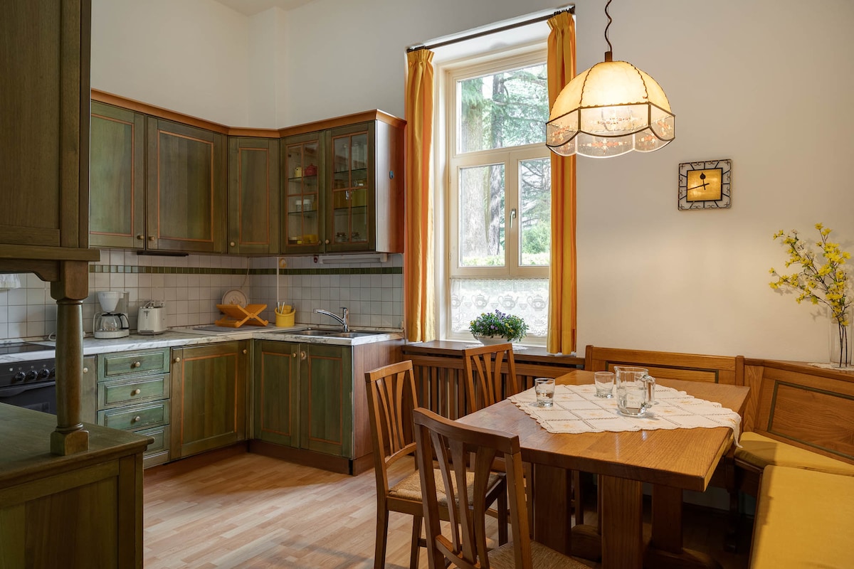 138 m²: n hieno huoneisto, yläkerroksessa, 1800-luvun lopun rakennuksessa, Bella Epoque -tyylinen. Erittäin tilava (noin 130 m²), sijaitsee erittäin hiljaisella alueella, ympäröityinä puistoilla ja puutarhoilla. Ilmainen yksityinen pysäköinti puutarhassa. Suuri olohuone, jossa on TV, erittäin tilavat makuuhuoneet, keittiö. Meranon keskusta on vain 10 minuutin kävelymatkan päässä, samoin kuin Kurhaus, kävelyreitit, historiallinen keskusta ja kaikki palvelut.