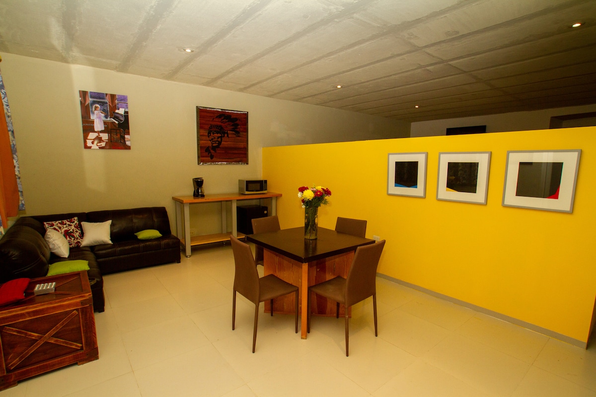 Tämä paikka on strategisesti sijaittu: vierailusi suunnittelu on erittäin helppoa! Kolme korttelia San José Iturbiden pyhätöstä. 1 minuutin päässä lähikaupoista. Helppo pääsy itäiseen Libramientoon 10 minuutin päässä Mission Hillsistä ja teollisuusalueelta. Keskustan huoneisto, lähellä yökerhoja ja baareja. Huoneisto 1 king-size-vuode 1 vuodesohva 1 kylpyhuone Varusteltu keittiö Pihamaalla Autotalli pienelle autolle *ei sisällä pesukonetta tai kuivausrumpua *