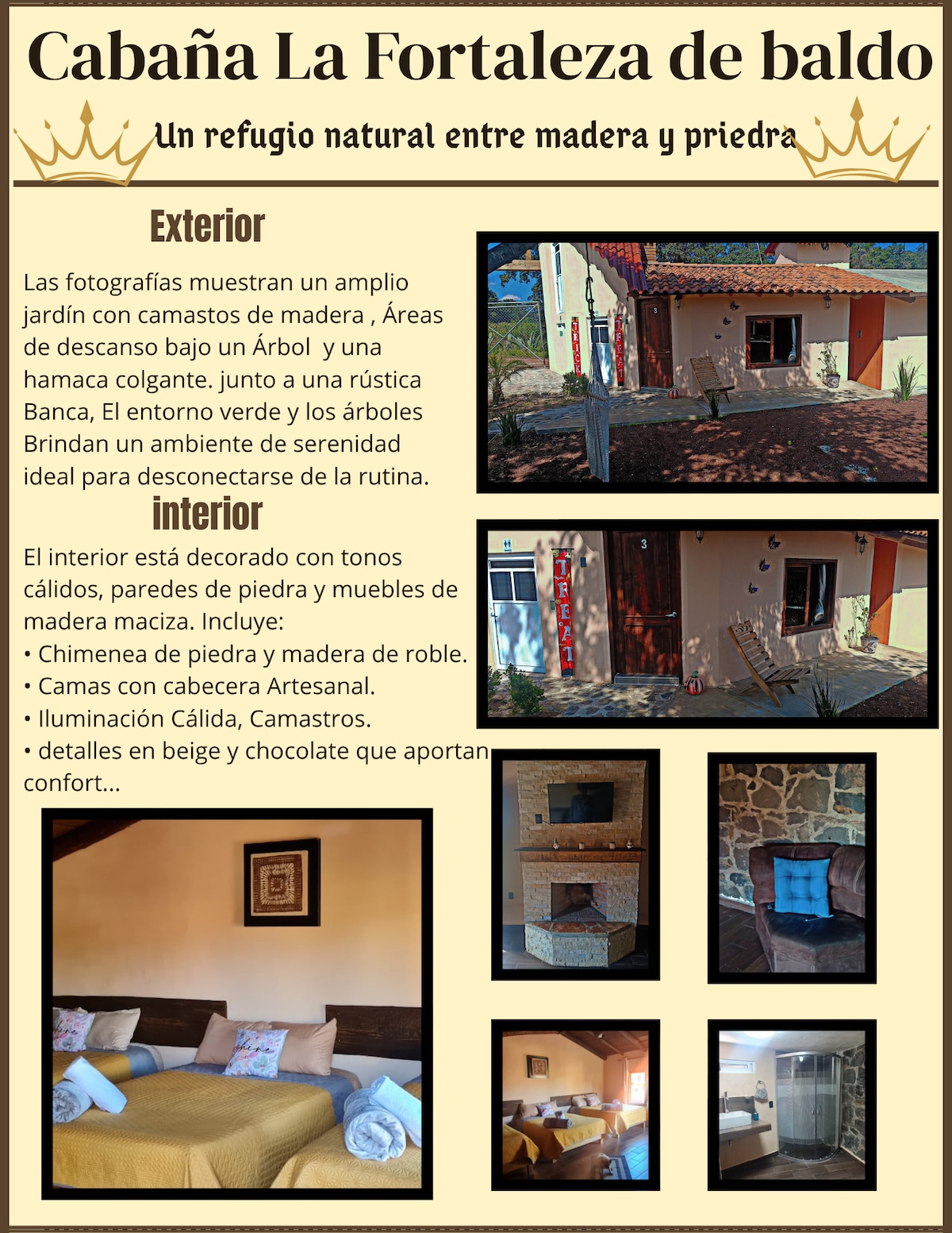 Ven y conoce la más bella cabaña Boutique del Parque Nacional del Chico, arquitectura moderna donde se funde el hierro, la madera y el barro cocido, en medio de un bosque rico en oyameles , ocotes y fauna silvestre. Un lugar lleno de quietud y paz que hará relajar tus sentidos y donde por las noches sentado al fuego de la chimenea y un par de copas de vino harán una velada romántica inolvidable o por las mañanas ver juntos el amanecer en nuestro increíble mirador hará de tu visita tu lugar ideal
