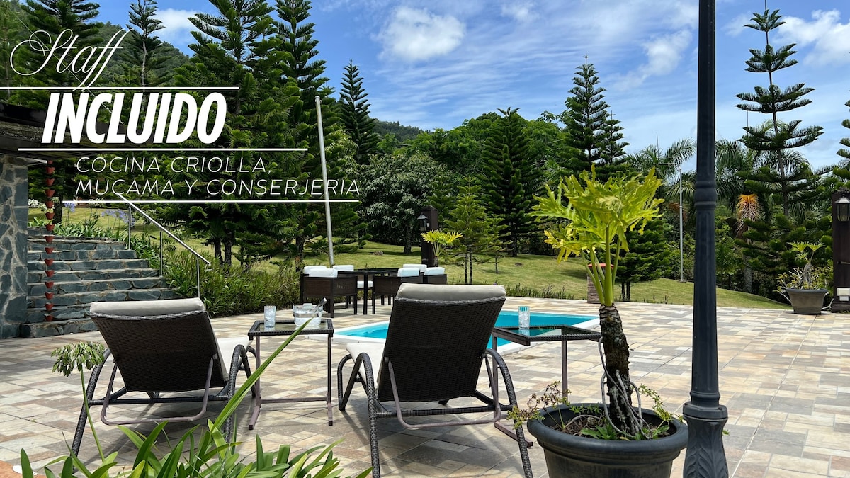 Staff, Cooking, and Cleaning Service Included! Villa Bartolo, with capacity for up to 20 people, is a true paradise in the heights of Jarabacoa, located in Mata de Plátano, where the Ébano Verde scientific reserve begins, and one of the most complete villas in the entire area. Our villa is characterized by having the most exquisite view, and an architecture that allows you to take full advantage of the view of valleys, mountains, and the greenery that characterizes the Cibao.