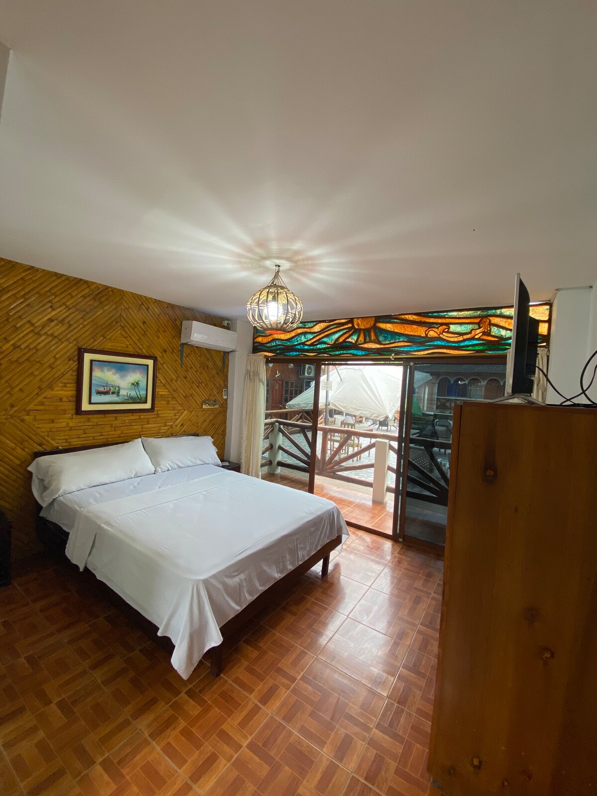 Pohjakerroksen huone, jossa on parivuode ja kaksi 1,5 hengen kerrossänkyä, ihanteellinen ryhmille tai perheille, joissa on enintään 6 henkilöä. Siinä on ilmastointi, toimiva yksityinen kylpyhuone, älytelevisio Netflixillä, kaappityyppinen teline ja vaateripustin. Mukava ja hyvin tuuletettu. Ilmainen pääsy uima-altaalle, keittiöön, grillille, puutarhoihin, riippumattoihin ja muihin tiloihin. Vain 7 minuutin päässä rannalta ja Montañitan keskustasta, mutta kaukana melusta. Rauhallisia ja tilavia majapaikkoja.