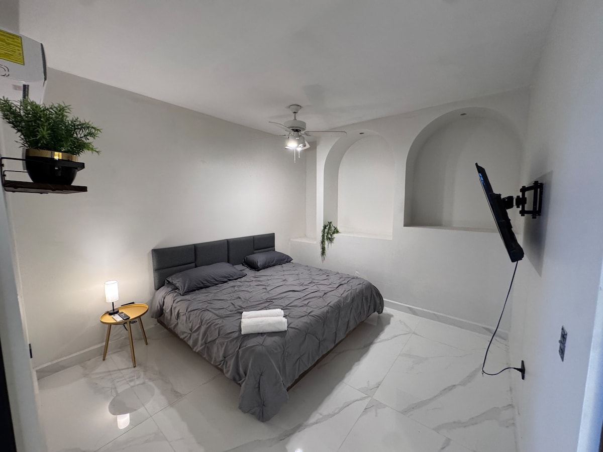 Moderni loft, mukava erillisellä sisäänkäynnillä, avainlaatikko. Rauhallinen. Wifi. Älytelevisio. Kylmä ja lämmin vesi. Mikroaaltouuni. Quin-size-vuode, rauhallinen paikka, jossa on pöytä ja istumapaikka. Minisplit. Jääkaappi. Mikroaaltouuni. Tuuletin. Pyyhkeet. Kehonpesuaineet, shampoo ja käsisaippuat. Blenderi, hiustenkuivaaja, silitysrauta ja silityslauta. Pieni keittokomero. Mikroaaltouuni. Paahtin. Tehosekoitin. Grilli. Lautaset, lasit ja tiskiallas. Minibaari. Hiustenkuivaaja.