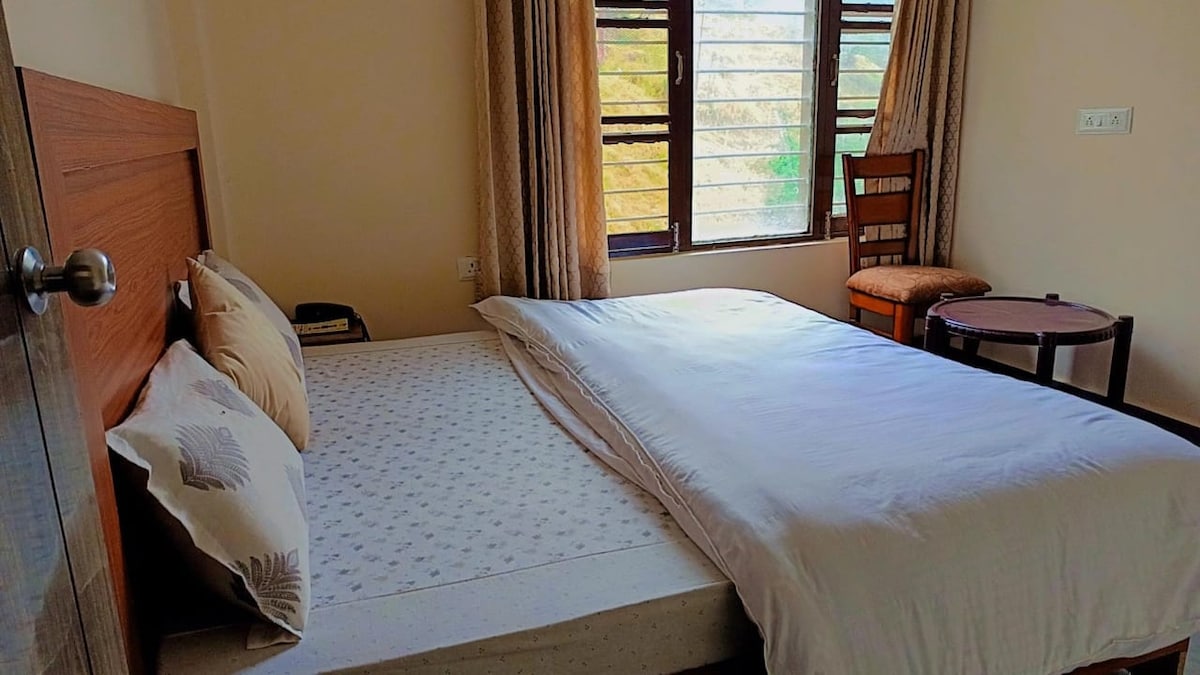 Cozy Room with Dining Area, Restaurant & Pool Access . Unwind in this serene and comfortable private room nestled in the hills of Bhimtal. Perfect for couples, solo travelers, or small families, the room offers a peaceful retreat surrounded by nature. Enjoy access to a beautiful shared dining area, an on-site restaurant serving local and multi-cuisine meals, and a sparkling pool to relax and soak in the sun.