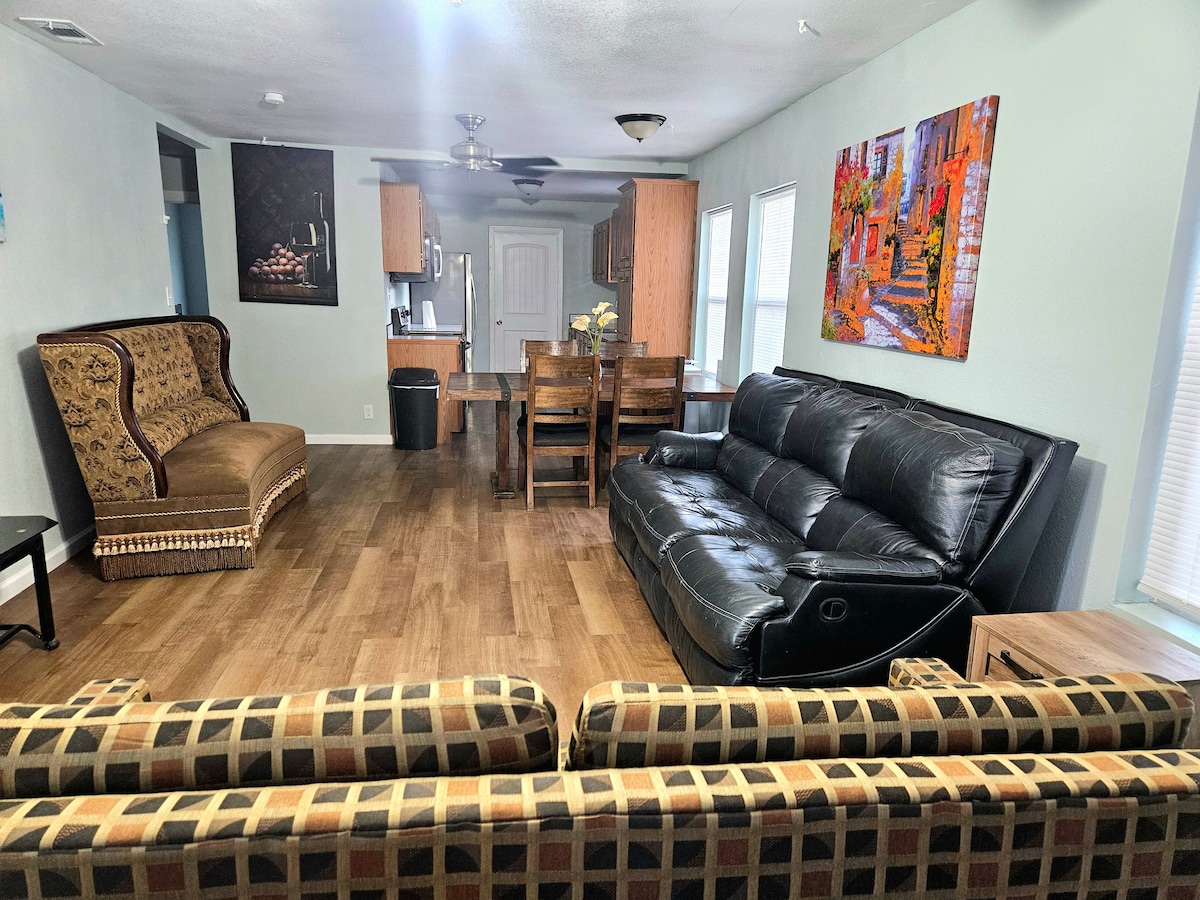 Kaukaisessa Etelä-Hobbsissa sijaitsevasta viehättävästä täysin remontoidusta ja päivitetystä kohteesta on nopea pääsy Eunice Hwylle (Hwy 18) sekä eteläiselle ohitustielle. Tässä 2 makuuhuoneen kohteessa on kaksi queen-vuodetta kussakin huoneessa sekä taitettava/futonisohva olohuoneessa. Kuituinternet-palvelun ja olohuoneessa sijaitsevan 50tuuman älytelevision ansiosta voit käyttää mitä tahansa omia tilausten katselupalveluja. Vakuuttaaksesi, että pesuhuoneessa on täysi pesukone ja kuivausrumpu.