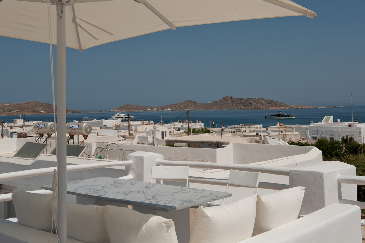 Upouusi, valoisa ja raikas huoneisto, jossa on kyklaadinen suunnittelu 2–6 vieraalle, merinäkymä, ihanassa Naousa de Parosissa, saa sinut kuiskuttamaan... "Mikä talo!". Vain 3 minuutin kävelymatka Naousan keskustasta, 6 minuutin kävelymatka lähimmälle rannalle, pysäköintitila kadun toisella puolella ja 2 kuistia, joilla voit nauttia kesätuulesta ja ihailla Mykonoksen ja Naxoksen maisemia. Tämä upea talo tarjoaa parhaat hetket kesästäsi! Voit vierailla luomuyrttitilallamme ja kokea paljon muuta!