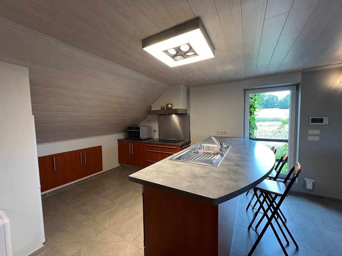 Upea moderni, valoisa ja viihtyisä yksiö täysin kunnostetun navetan 1. kerroksessa. Rauhallinen, keskellä Ardenneja, 100 m elintarvikekaupoista, 200 m ostoskeskuksesta. Ihanteellinen pariskunnille. Varusteltu keittiö, erillinen kylpyhuone, jossa italialainen suihku ja wc. Suuri 25 m2:n terassi, jossa on pöytä 2 hengelle ja puutarhakalusteet (kesällä). Pesukone yhteinen muiden yksiöiden kanssa. 160 cm leveä parisänky + vuodesohva (1 aikuiselle tai 2 lapselle) samassa huoneessa.