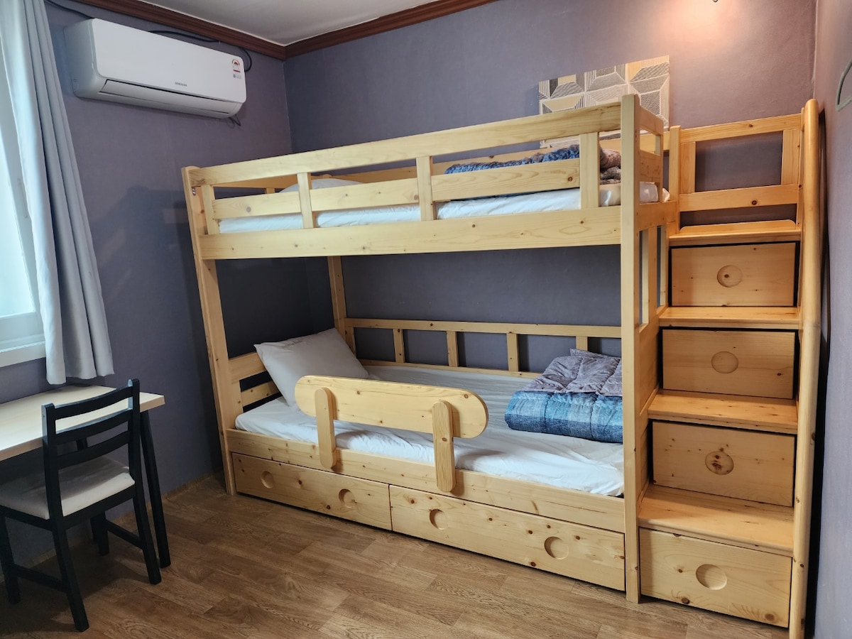 * 5 minuutin kävelymatkan päässä Sacred Heart Cathedral Main Storesta, * 2 minuutin kävelymatkan päässä Jungangnon asemalta, * 10 minuutin kävelymatkan päässä Daejeonin asemalta, 9 minuutin ajomatkan päässä Hanwha Baseball -stadionilta Meillä on uusi parivuode, jossa voit levätä kätevästi ja miellyttävästi, ja siinä on vaatekaappi, pöytä, tuoli, TV, jääkaappi ja peili. Saatavilla on myös hiustenkuivaajia ja kihartimia. Kylpyhuoneessa on shampoo, hoitoa, vartalonpesuainetta, hammastahnaa, hammasharjaa, pyyhettä ja wc-paperia. Jaetussa keittiössä on pesukone, kuivausrumpu, vedenpuhdistin, induktio- ja ruoanlaittovälineet, joten se on erittäin kätevä pitkäaikaisiin majoittumisiin. Pysäköinti on sallittua.