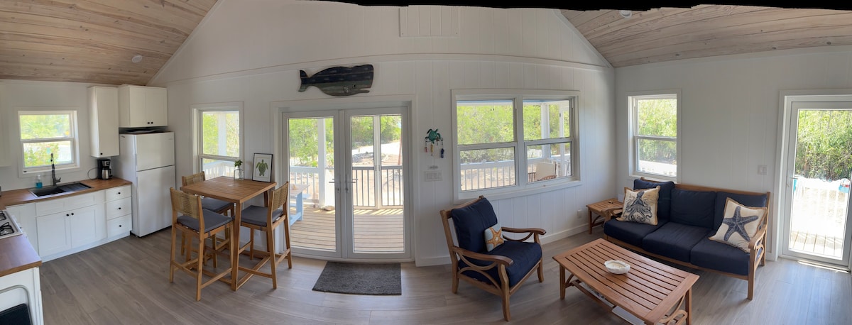 Korkealla saarella asuminen aivan uudessa 2/2 rantamökissä. Saarituulia riittää! Keskeisellä paikalla sijaitseva, josta on 360 näkymää Long Bayhin, Bita Bayhin ja White Soundiin. Alle minuutin kävelymatka saaren Atlantin valtameren puolelle. Useita suojattuja ja avoimia ulkotiloja nautittavaksi. Kattoterassilta on korkein näkymä saarelle. Ulkoilma-alue, jossa voit nauttia aamukahvista tai auringonlaskusta viinilasillisesta. Voit ihailla Bita Bayta, Long Bayta ja White Soundia Voit katsella auringonnousua tai veden aaltoja. Hyödyllinen monella tapaa! Talon pääkerroksessa on tilava makuuhuone, jossa on queen-vuode ja kylpyhuone. Upeassa avoimessa huoneessa on holvikatto ja viereinen keittiö, jossa on kaikki mitä tarvitset omien aterioidesi valmistamiseen. Voit katsoa Direct TV:tä tai DVD-levyjä ruoanlaiton aikana. Aivan keittiön ulkopuolella ja ranskalaisten ovien läpi on suuri suojattu kuisti, jossa on pöytä syömiseen ja pelaamiseen. Propaanigrilli on valmis grillataksesi päivän saaliisi. Yläkerrassa toisessa kerroksessa on makuuhuone ~ Suite Dreams. Siellä on king-vuode, mukava tuoli, johon voi käpertyä, ja yksityinen kuistia, josta on näkymät Atlantin valtamerelle. Kylpyhuoneessa on kaksinkertainen pesuallas, ja siellä on kahviautomaatti, mikroaaltouuni ja minijääkaappi. Siellä on seinään asennettu TV ja lukuisia DVD-levyjä nautittavaksi. Talo on varustettu vahvalla wifi-yhteydellä kaikilla tasoilla.