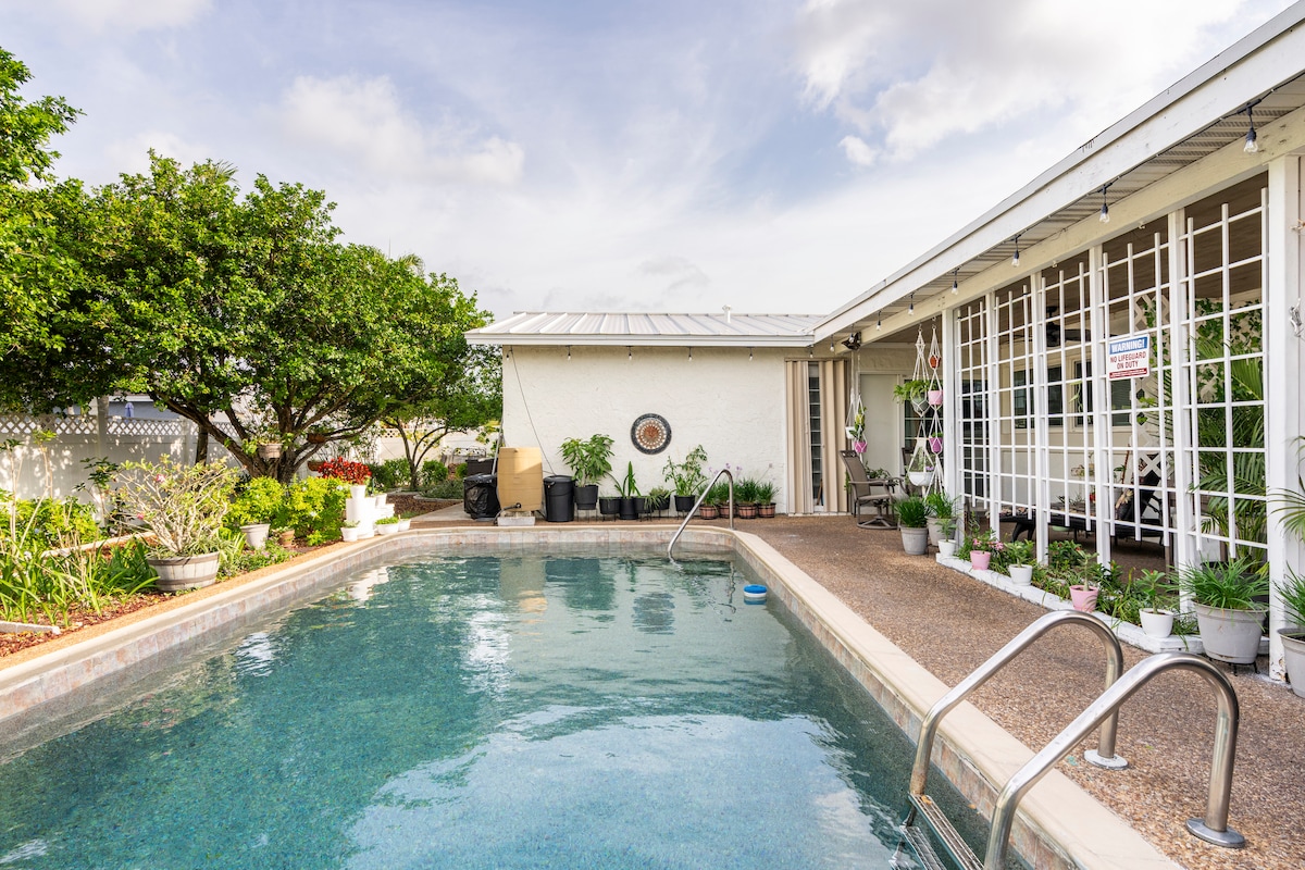 Puhdas! Studio/vierassviitti (vierekkäin kotini kanssa) – Sijaitsee Hard Rock Stadiumin ja Hard Rock Casinon/Hotellin välissä. 400 neliömetrin yksityinen tila, KAKSI queen-vuodetta (NELJÄ HENKILÖÄ), minijääkaappi, mikroaaltouuni ja TV. WiFi, avaimeton ulko-ovi "in-law apt"/"hotelli"-tyyppiseen huoneeseesi. Jaettu pysäköinti ajotiellä ENINTÄÄN KAHDELLE VIERAAN AUTOLLE. Jaettu takapiha perhospuutarha, patio ja uima-allas. Huoneessa ilmastointilaite ja suihkutila... ja paljon muuta!
