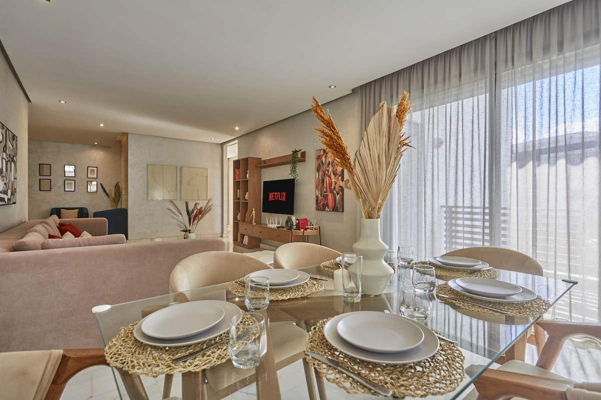 Ylellinen ja moderni huoneisto 5 minuutin päässä Mohamed V:n lentokentältä, tarjoaa mukavuutta ja rentoutumista matkustajille, joilla on välilasku, ja liikematkailijoille. Huoneisto koostuu olohuoneesta, jossa on äly-tv ja kotiteatteri, ruokailuhuoneesta, kahdesta makuuhuoneesta, joissa on parvekkeet ja uima-allasnäkymät, sekä vanhempien sviitistä ja vieraan kylpyhuoneesta. Talon vuodevaatteet ovat kokonaan Simonsin valmistamia optimaalisen mukavuuden takaamiseksi.