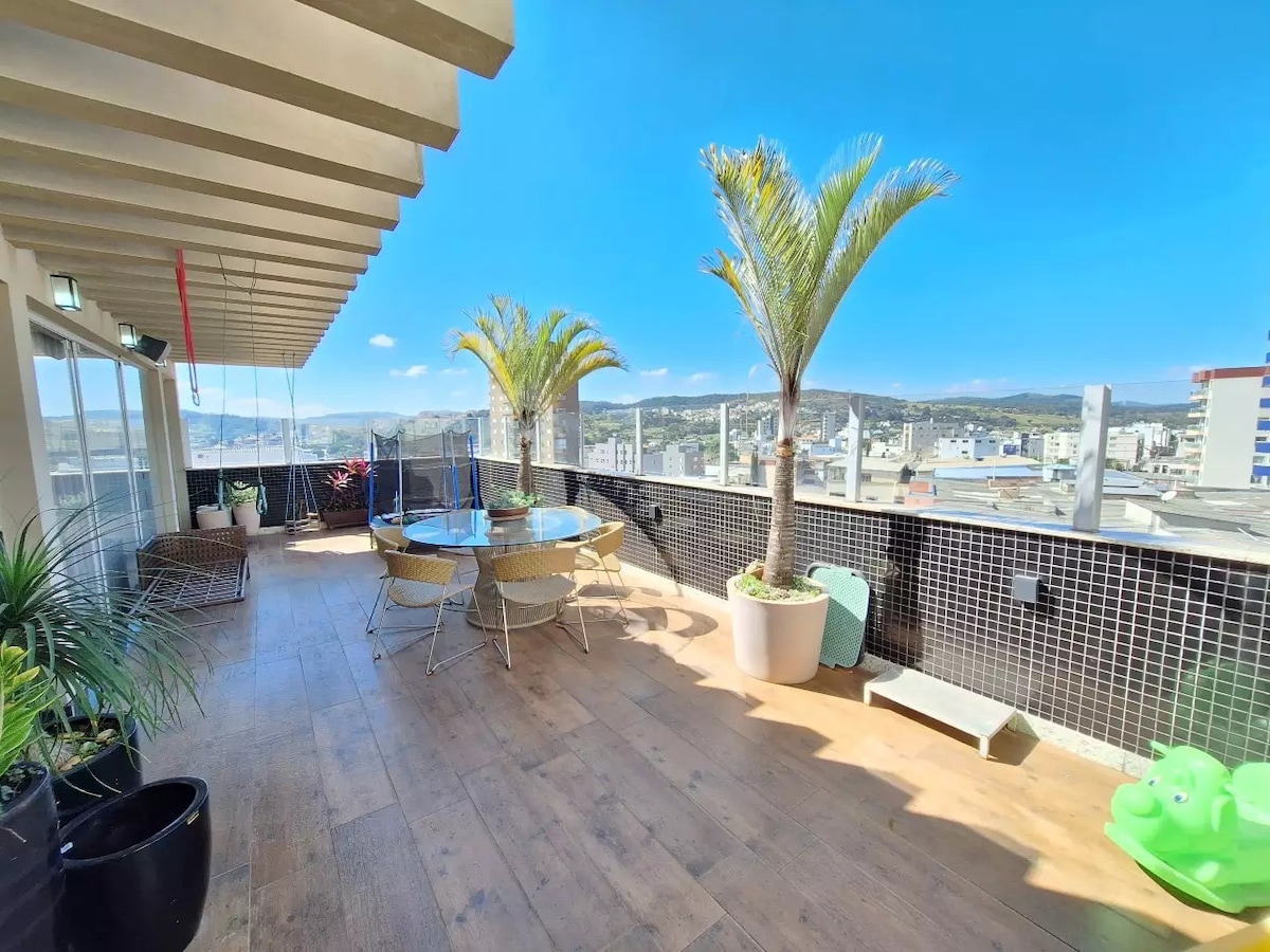 Cobertura no bairro St. Antonio, entrada independente, 5 minutos do centro, 100 m Churrascaria do Serginho. Area externa ampla, com piscina iluminada. Area interna com cozinha americana com bancada grande em L e banquetas. Churrasqueira, fogão à lenha, fogão à gás, galadeira duplex, cozinha completa com bebedouro. Sala com sofá grande e TV. Suite com cama quen e chuveiro. Uma vaga de garagem. WiFi. Vista panorâmica para o lago da Sidil, fazendo contraste com a mata e Centro da Cidade