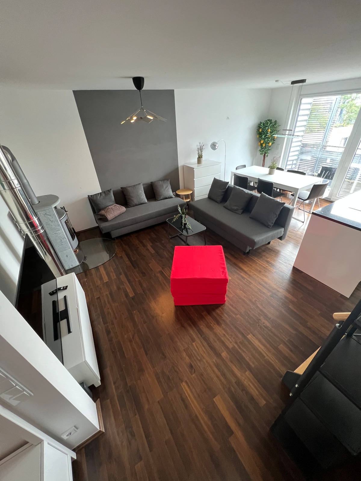 Noin 120 neliömetrin loft sijaitsee kerroksessa 3 perheen talossa ja se ulottuu kahdelle tasolle. Valoisa, äskettäin kunnostettu huoneisto tarjoaa runsaasti tilaa pariskunnille, ryhmille tai perheille. Ikkunat voidaan pimmentää kokonaan ulkopuolisella rullaverholla. Sisäänkäynti on yhteisen portaikon kautta. Käytettävissä on TV, audio, Wi-Fi, LAN. Tarjolla on myös valikoima seuranpelejä kaikenikäisille, kirjoja ja DVD-levyjä. Kaikki muut ideat/toiveet ovat tervetulleita.