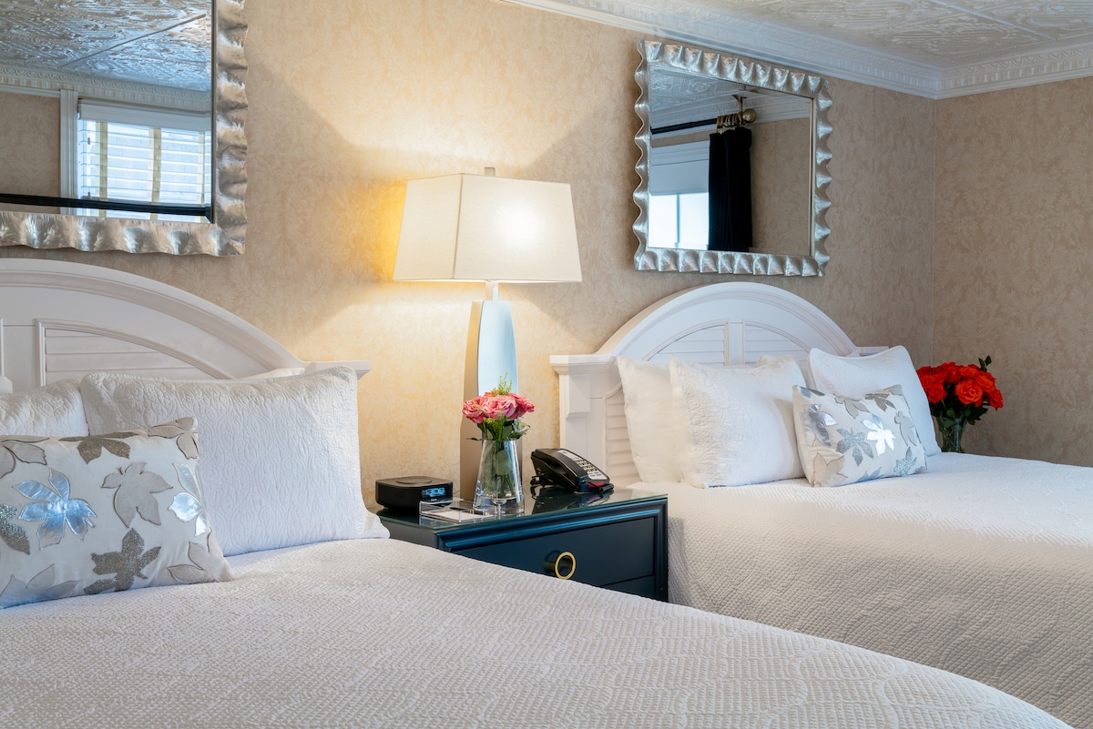 The Ocean Balcony Suite is a new, exciting addition. This third floor room features oceanfront views, two king beds, a brand new private bathroom, and a totally revamped appearance. The Ocean Balcony Suite is painted dove grey, with a pillow-top mattresses, a 50-inch Smart TV with live TV access, air conditioning, heat and environmentally-friendly, paraben free Essentiel Elements toiletries. The private bathroom has a stand-in shower.
