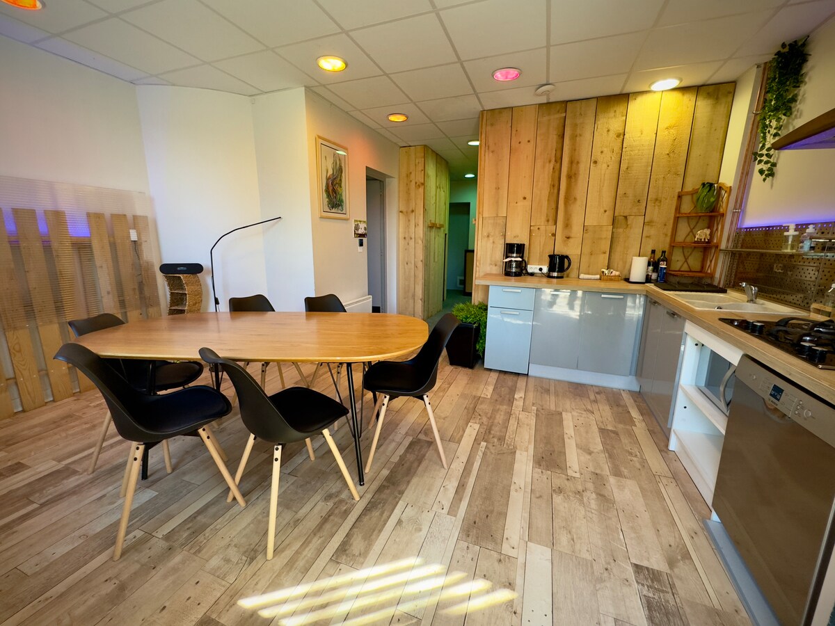 Aito 2 huonetta täysin kunnostettu. Valoisassa 38 m2:n huoneistossa, johon pääsee noin viidentoista askelman portaikosta, on täysin varustettu keittiö, joka on avoinna olohuoneeseen ja ruokailutilaan. Olohuoneessa on televisio. Majoituksessa on todellinen erillinen makuuhuone (queen size -patja 160 x 200) ja pieni vaatekaappi. Kylpyhuone, jossa on suihku ja valaistu peili + sähkölämmitys. Erillinen wc. Nespresso-kahvikone, 2 ilmaista kapselia.