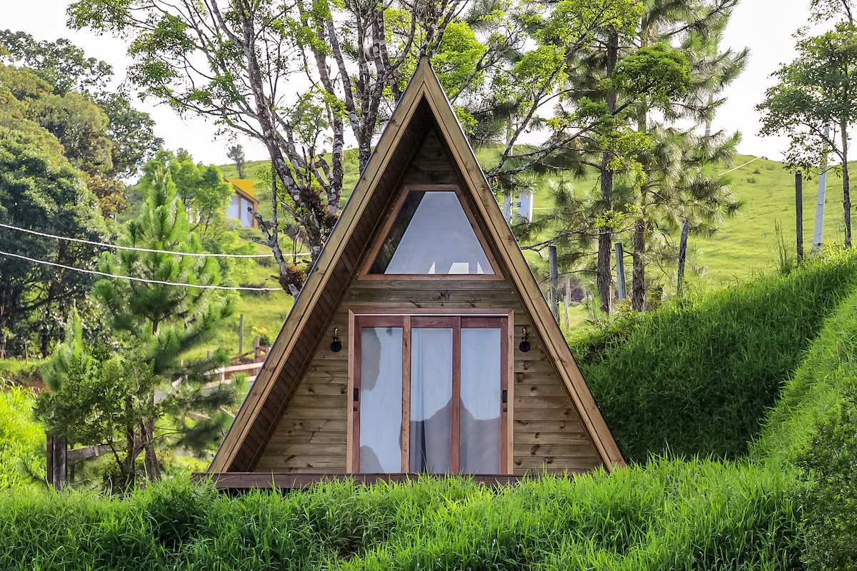 Ylellinen kolmionmuotoinen mökki kylpyammeella ja näkymällä