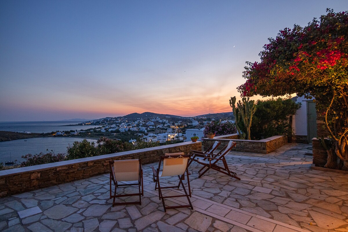 Vuoden 1870 uusi uusklassinen kaupunkitalo sijaitsee Ermoupolisin sydämessä. Koko toinen kerros, joka on varattu vieraillemme, on tilava ja aurinkoinen sviitti, josta on upeat näkymät kaupunkiin ja Egeanmereen. Siinä on 2 makuuhuonetta, 1 kylpyhuone, olohuone, josta on pääsy parvekkeelle, ja keittiö. Kolmannessa kerroksessa on valtava terassi. Tila on täydellinen perheille, pariskunnille tai ystäväjoukoille, ja kaikki on hyvin lyhyen kävelymatkan päässä.