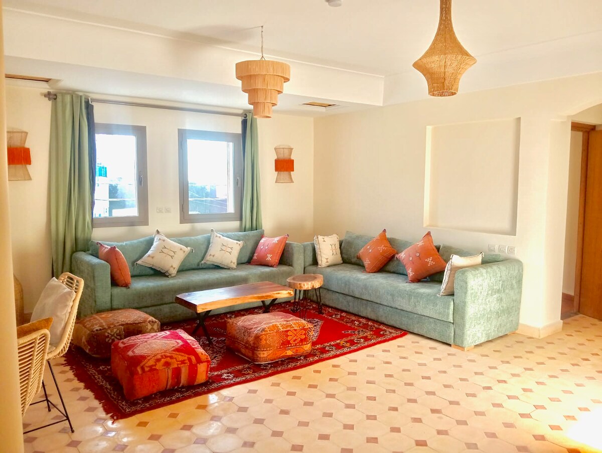 Tämä ylimmän kerroksen huoneisto on hiljainen ja mukava paikka asettua majoittumisen aikana. Makuuhuoneessa on käsintehtyjä puuyksityiskohtia, 160 × 200 cm:n sänky ja runsaasti luonnonvaloa. Olohuoneessa on perinteinen amazigh-tyylinen salongki, ja keittiö on täysin varustettu todelliseen ruoanlaittoon. Olet rauhallisessa kaupunginosassa, lähellä kahviloita ja kauppoja ja noin 20 minuutin kävelymatkan päässä Banana Pointista. Se on yksinkertainen, valoisa tila, jossa on helppo rentoutua, olitpa täällä muutaman päivän tai pidempään.