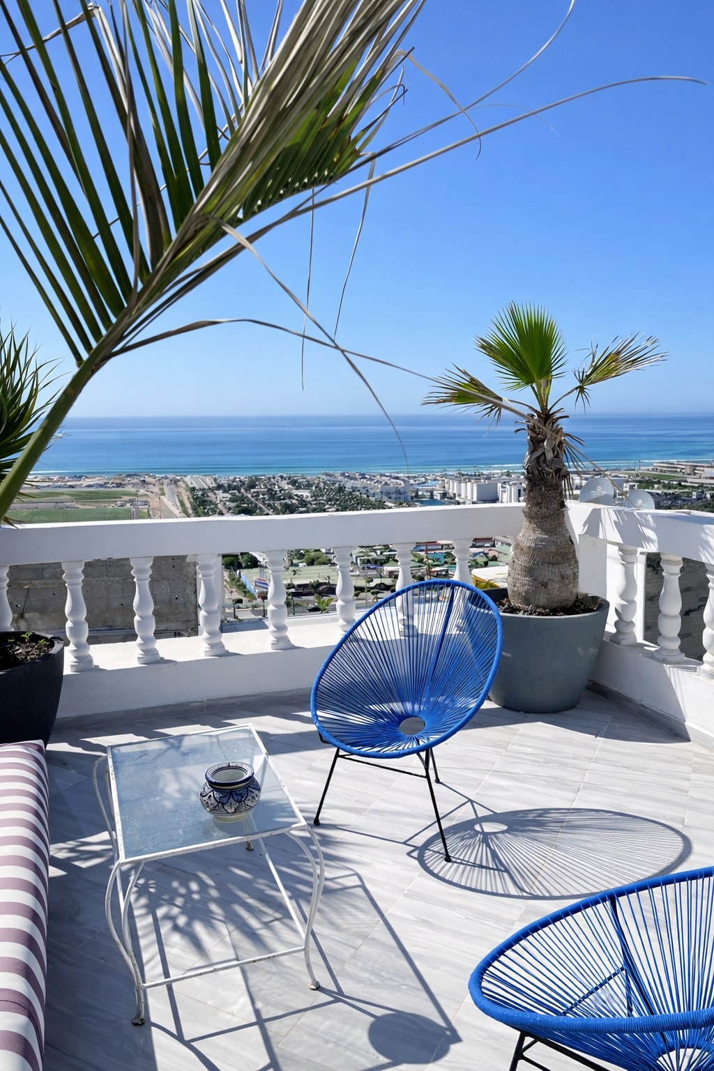 Tilava, valoisa ja mukava huoneisto rauhallisessa ja turvallisessa asuinalueella meren rannalla Agloussa. 95 km Agadirista etelään ja 15 km Tiznitistä. Suurelta terassilta on näkymä merelle ja vuorille. Asuinalueella on 2 ulkouima-allasta, joista 1 on lapsille, ja ilmainen pysäköinti. Pääsy rannalle asuinalueelta. Yläkerran 183 m2:n huoneisto sisältää 3 makuuhuonetta, 2 kylpyhuonetta, pukuhuoneen, täysin varustellun keittiön, olohuoneen ja ruokailuhuoneen, wifi