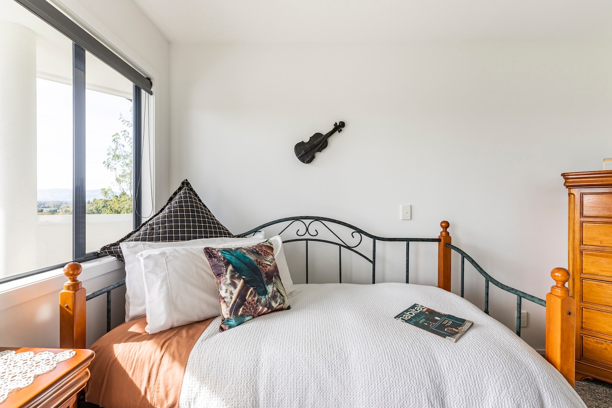 Private self-contained apartment with two bedrooms, open plan living, dining, kitchenette and bathroom. Master bedroom with Queen bed. Second bedroom can be used as bedroom or as separate dedicated office. Portable cot available. Large floor to ceiling windows and sliding door in living area open into a private self-enclosed patio with BBQ. Apartment has heatpump, is fully insulated and double glazed throughout. TV has NZ Freeview. Wireless and wired Internet access throughout.