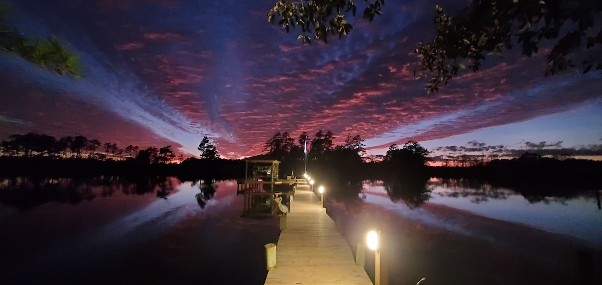 Eteläisen rannikon elämää parhaimmillaan! Todellinen pakopaikka yhteiskunnan vaatimuksista suoraan rannikon sisävesiväylällä. Kodikas & yksityinen 1 makuuhuone 1 kylpyhuoneen vaunutalo, joka sijaitsee 15 hehtaarin alueella Pamlicoinsalmen ja Goose Creek State Parkin välissä. Nauti panoraamanäkymistä yksityiseltä parvekkeeltasi. Pääsy ranta-alueelle ja venelaiturille. Laiturin vieressä on pieni vesiskootteri, vesiskoottereille, kajakkeille ja SUP-laudoille. Seulotun huvimajan yhteiskäyttö. Tule rentoutumaan ja nauti siitä!