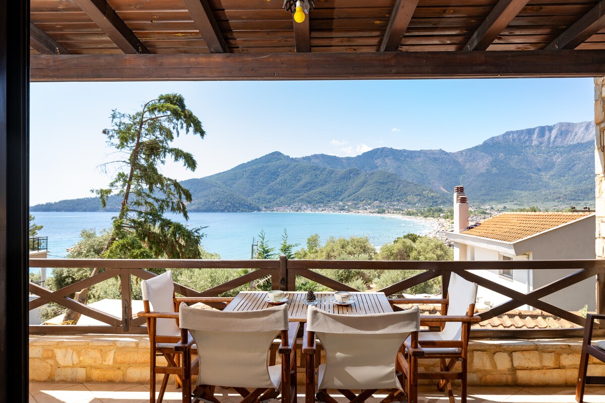 Moderni talo upealla näköalalla, rakennettu vuonna 2004, kreikkalaisella perinteisellä arkkitehtuurilla (kivi ja puu). Vain 150 metrin päässä saaren kuuluisimmasta rannasta (kultainen ranta) sijaitseva talo (huvila) on ihanteellinen perheille, jotka etsivät mukavuutta ja rentoutumista sekä kauneutta ja harmoniaa.