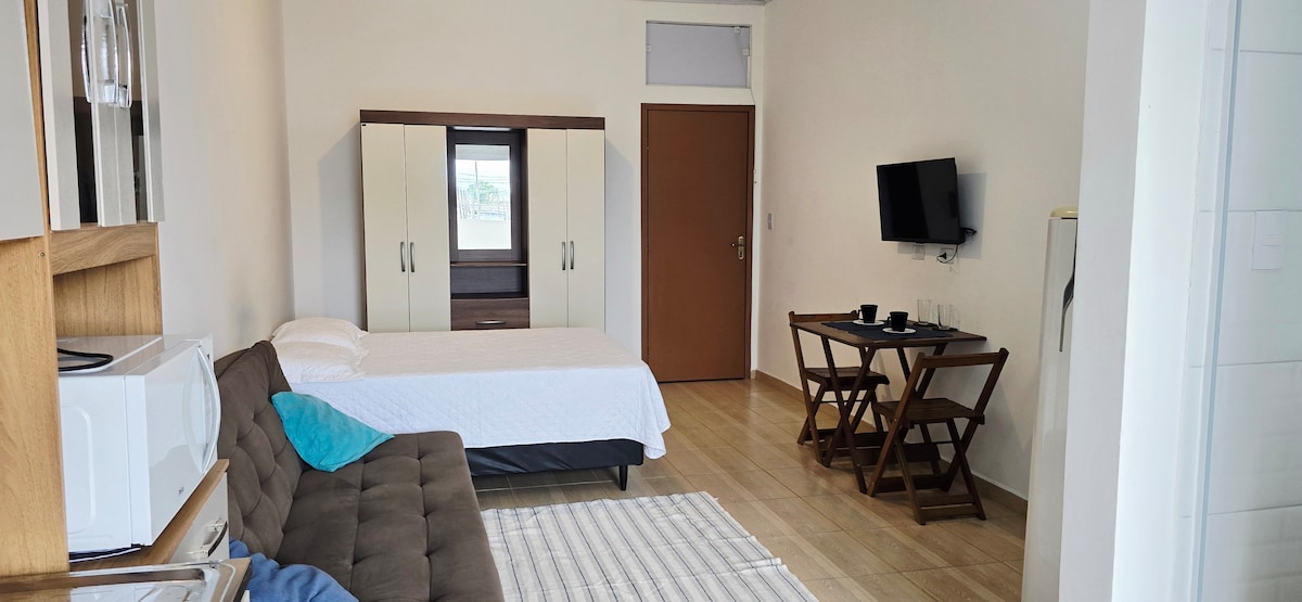 Studio Nova, nopea wifi, 3. kerros. Sijaitsee 3 minuutin päässä Centro de Paranaguásta, akvaariosta, valtatieltä, julkisilta markkinoilta, baareista sekä leipomoista, apteekeista, supermarketeista, Paranaguán satamasta ja Rocion pyhäköstä. Varustettu jääkaapilla, vedensuodattimella, mikroaaltouunilla, voileipägrillillä, vedenkeittimellä, ilmakeittimellä, 43 tuuman televisiolla, ilmastoinnilla, silitysraudalla ja hiustenkuivaajalla. En tarjoa kylpypyyhkeitä ja hygieniatarvikkeita. Autotalli – tarkista saatavuus