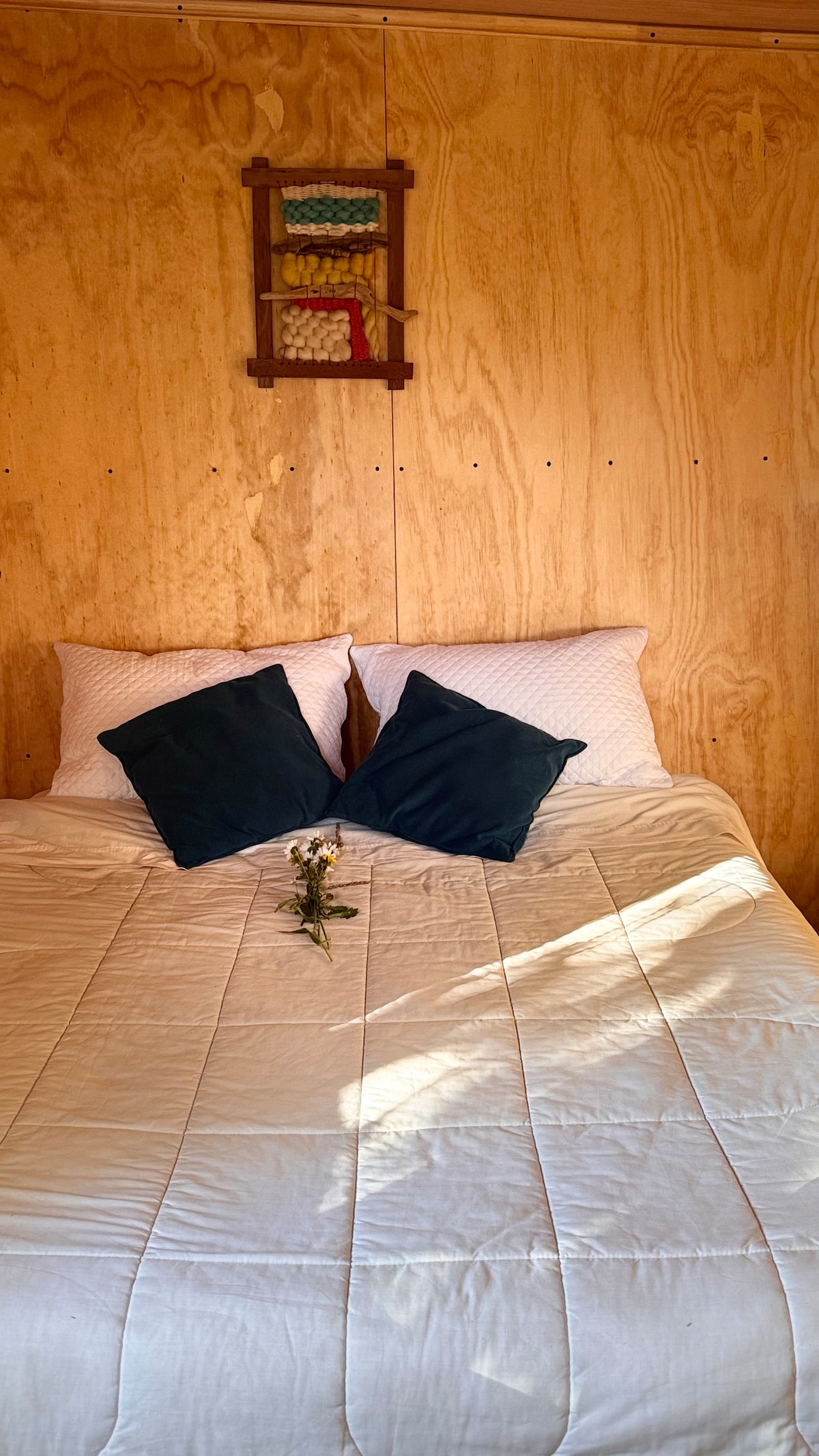Este glamping es un refugio cómodo y acogedor en plena naturaleza de la Carretera Austral. Cuenta con cama king size, plumón, calefacción, electricidad e iluminación cálida, además de un proyector para noches de cine y desayuno incluido. Incluye toallas, frazadas, linternas y una carga de lavandería por noche. El baño es compartido, pertenece al camping, está limpio y es de fácil acceso. Ideal para dos personas que quieren vivir la naturaleza sin renunciar al confort.