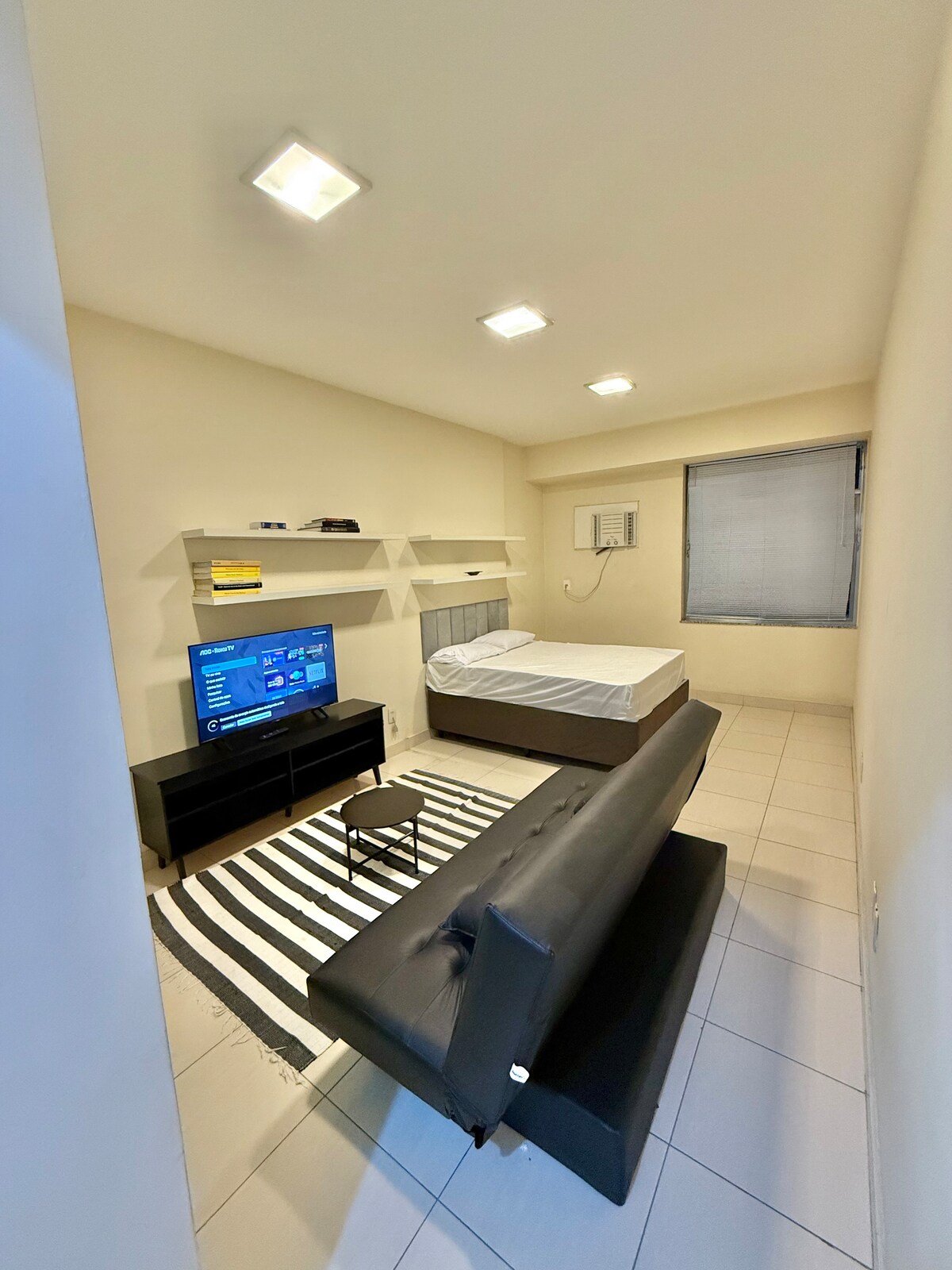 Espaço inteiro. O apartamento é amplo, aconchegante, organizado, bem arejado e iluminado, com sol da manhã. No quarto, há uma cama queen (euro colchão super premium) e um closet espaçoso. A sala é grande, com mesa de jantar, sofá-cama (casal) e uma varanda com plantas e rede. A cozinha é completa, equipada com todos os utensílios necessários. O banheiro foi reformado e possui chuveiro 220v. O ambiente conta com ar-condicionado, ventilador de teto e ventilador portátil de chão.
