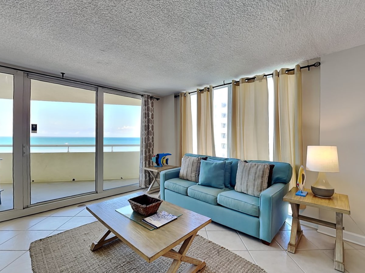 Shabby chic & modern, coastal and cozy. Ylellinen condo-huoneisto 6. kerroksessa tornissa 3. RANTA-ALUE, UPEA NÄKÖALA, YLISUURI PARVEKE! *2 makuuhuonetta/2 kylpyhuonetta huoneisto ~nukkuu 8 * Memory foam -vuoteet isossa makuuhuoneessa ja toisessa makuuhuoneessa. Queen-vuodesohva *Yksityinen ranta *Täysin varusteltu keittiömestarin keittiö *Älytelevisiot *Syöttötuoli, pakkaaminen/leikkiminen, pelit ja paljon muuta. *Rantakomero/laitteiden käyttöoikeus