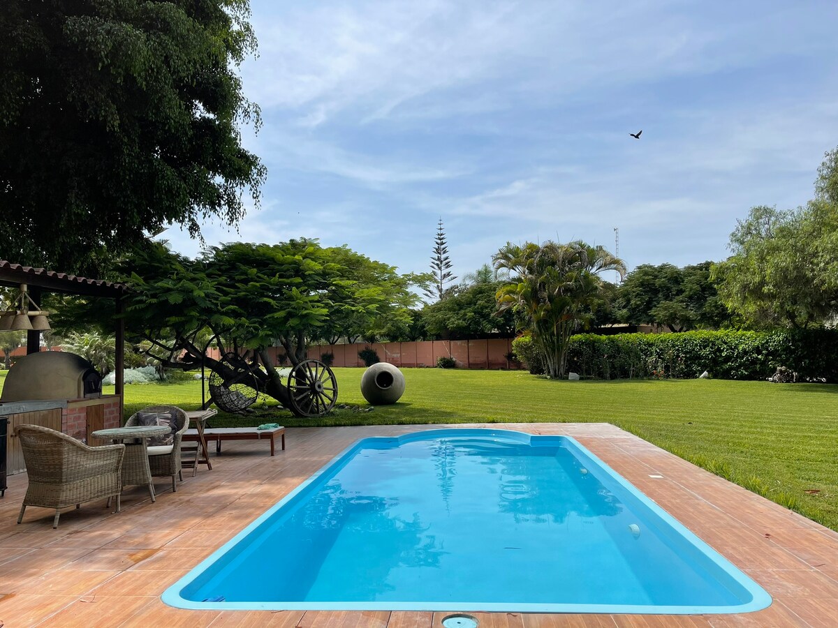 Vähän Toscanaa Chinchan sydämessä. Mukava talo kylässä San Regis, vieressä talon Hacienda samanniminen, yhteisössä Carmen, 5 minuutin päässä Hacienda San Jose. Maalaistalo, 3 makuuhuonetta Toteutettu kukin on oma kylpyhuone, olohuone, ruokailuhuone, terassi ja uima-allas. Vineyard sisällä kiinteistön ja näytti hedelmäpuita. Tilavat puutarhat ja kaunis näköala maaseudulle ja merelle.