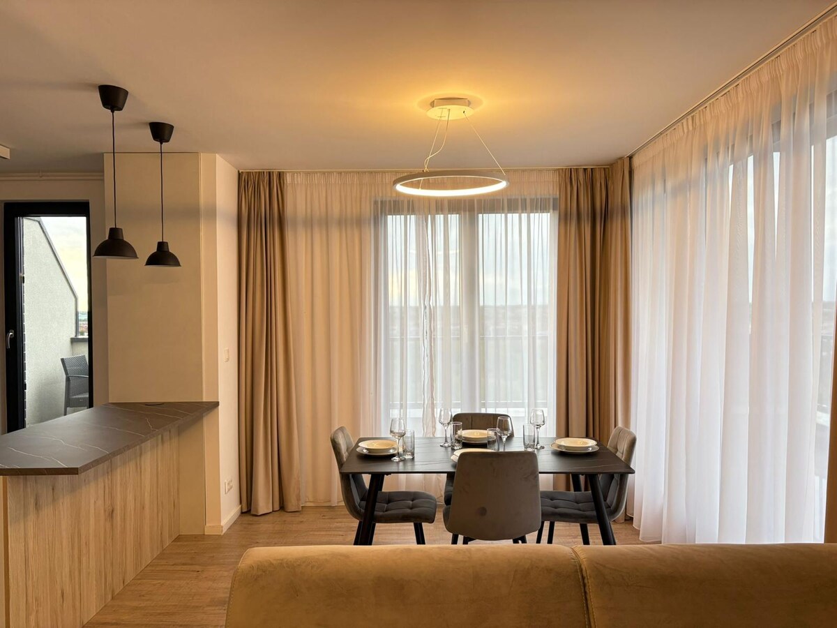 A brand-new, premium smart apartment located in the business development area of Pipera Nord. Furnished with modern, high-quality materials and brand new appliances. Self Check-in, Smart home devices, Private underground Parking, Large 4K Smart TV, a Spacious sofa and a Comfortable Queen bed for relaxation make this apartment unique among others.