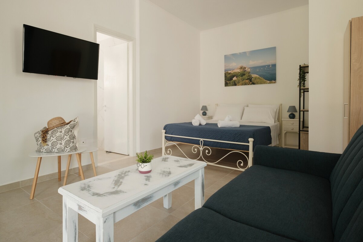 Rita's Home is brand new, tastefully furnished, 53m² , upper-floor apartment for 5 person. Only 50 meters from Acharavi's sandy and pebbly beach, where you'll find restaurants, bars, and also sunbeds are available. Ideal for 4 adults or 4 adults and 2 children. The apartment has 2 separate bedrooms, 2 bathrooms, and a living room with a large sofa that opens into a double bed (150*200). Comfortable, high-quality mattresses. Well-equipped kitchen. Air conditioning in every room
