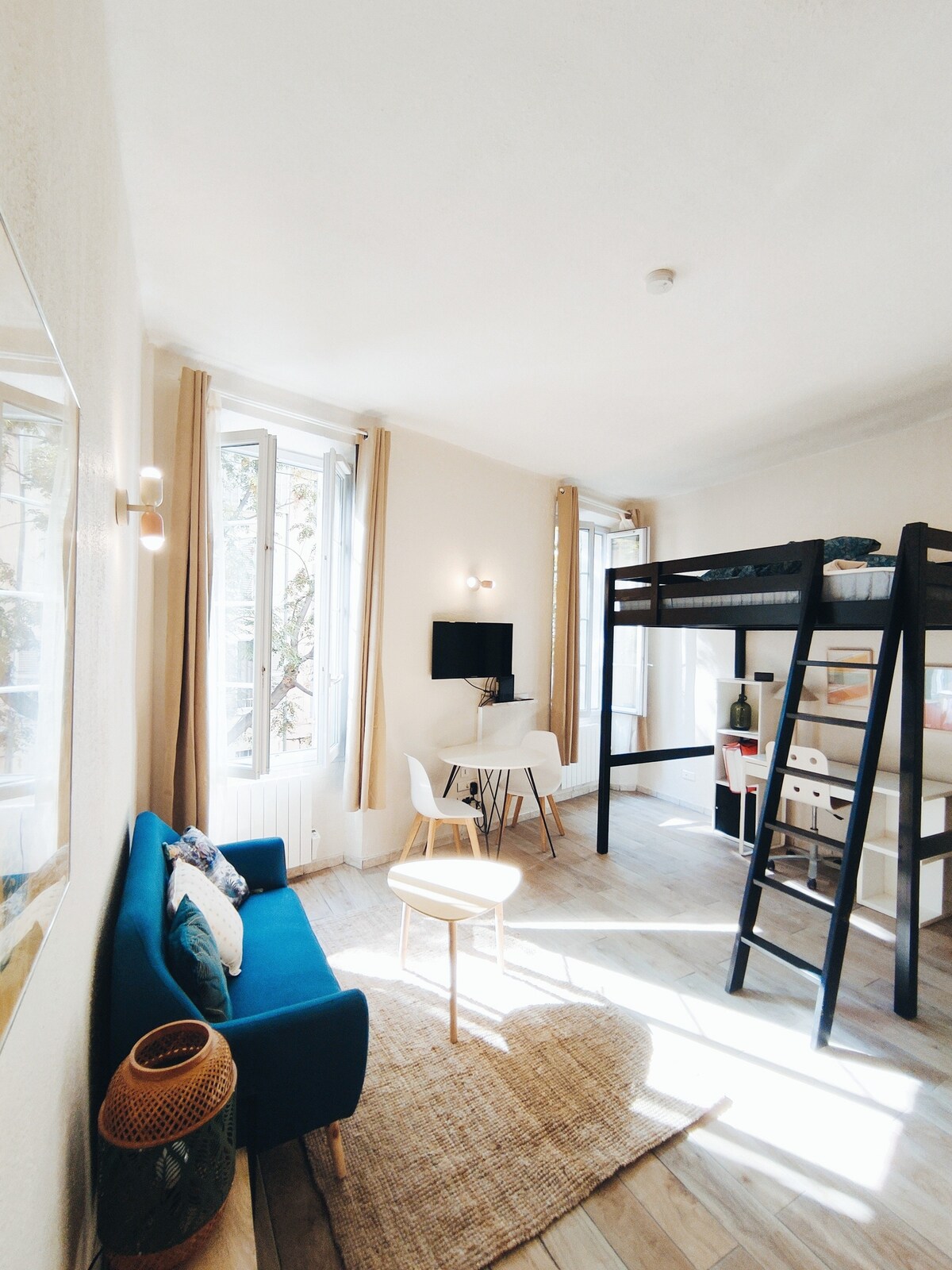 50 m2:n T2-huoneisto, vanhan rakennuksen toisessa kerroksessa keskellä kaupungin keskustaa, Toulonin kävelykadulla. Rakennuksen juurella on vilkas ja ystävällinen alue, viinibaareja, ravintoloita, kauppoja ja gallerioita! Asunto koostuu kauniista olohuoneesta, olohuoneesta, jossa on 2 sohvaa (joista yksi on vuodesohva) ja ruokailuhuone, keittiö ja suuri makuuhuone (160 cm vuode) kylpyhuoneella (kylpyamme) ja wc:llä. Asunto sijaitsee 10 minuutin kävelymatkan päässä rautatieasemalta ja 2 minuutin kävelymatkan päässä bussipysäkeistä ja laivakäytävistä.