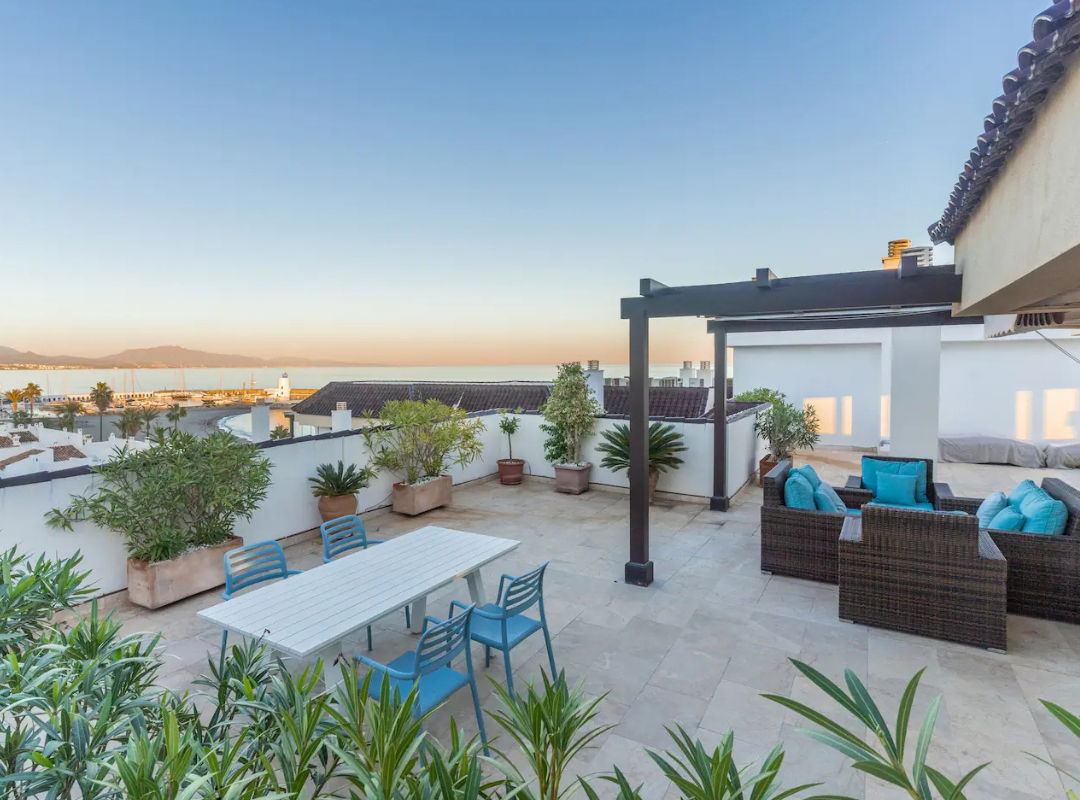Täysin varusteltu kattohuoneisto, jossa on merinäkymät suurelta terassilta. Kohteessa voi majoittua ympäri vuoden, ja se sopii erinomaisesti syksyyn, talveen ja kevääseen, jolloin voit todella nauttia terassista. 2 makuuhuonetta, 2 kylpyhuonetta, 4 hengelle. Päämakuuhuone, josta on pääsy terassille. Erittäin tilava, noin 90 neliömetriä. 1 täydellinen kylpyhuone päämakuuhuoneen sisällä, erittäin tilava olohuone. Wifi on 600 Mb nopea, sitä nopeampi ja TV, jossa on 200 eurooppalaista kanavaa, brittiläisiä, saksalaisia, ranskalaisia jne.