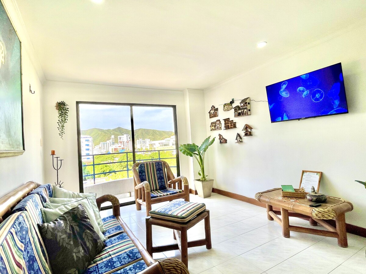 A *fully furnished modern suite* in Santa Marta just a short walk from Salguero Beach & close to El Rodadero, one of the city's most popular tourist spots. ✨ Highlights: Rooftop pool, Jacuzzis, Sauna, Turkish Bath, Game room, & Gym. MORE ⬇️. The building has free parking for visitors, subject to availability. The suite has a mountain view. Whether you're looking to unwind or explore, this suite is the perfect base for your time in Santa Marta.