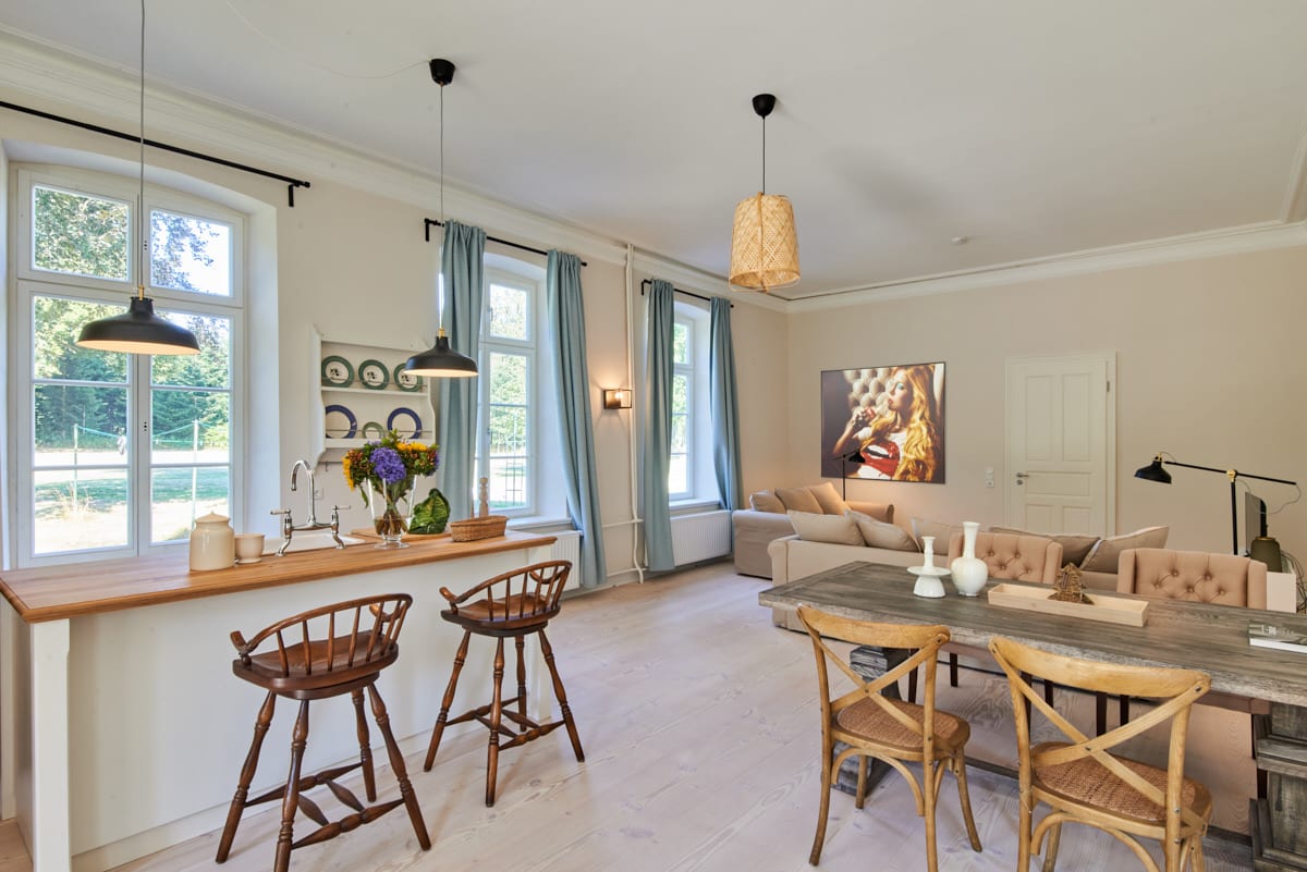 Kaunis veranta johtaa tähän tilavaan kahden huoneen huoneistoon. Kalkkimaalatut linnan lattialaudat ja leveät ikkunoiden julkisivut saavat Gutes Rantzaun vanhan puutarhan 50 m2: n puutarhahallin näyttämään kutsuvalta ja valoisalta. Käsin valmistettu maalaiskeittiö, jossa on englantilainen pesuallas ja viihtyisä keskikortteli, kutsuu sinut laittamaan ruokaa syksyisin. Komeat kattokorkeudet ja stukkolistat tekevät siitä erityisen.