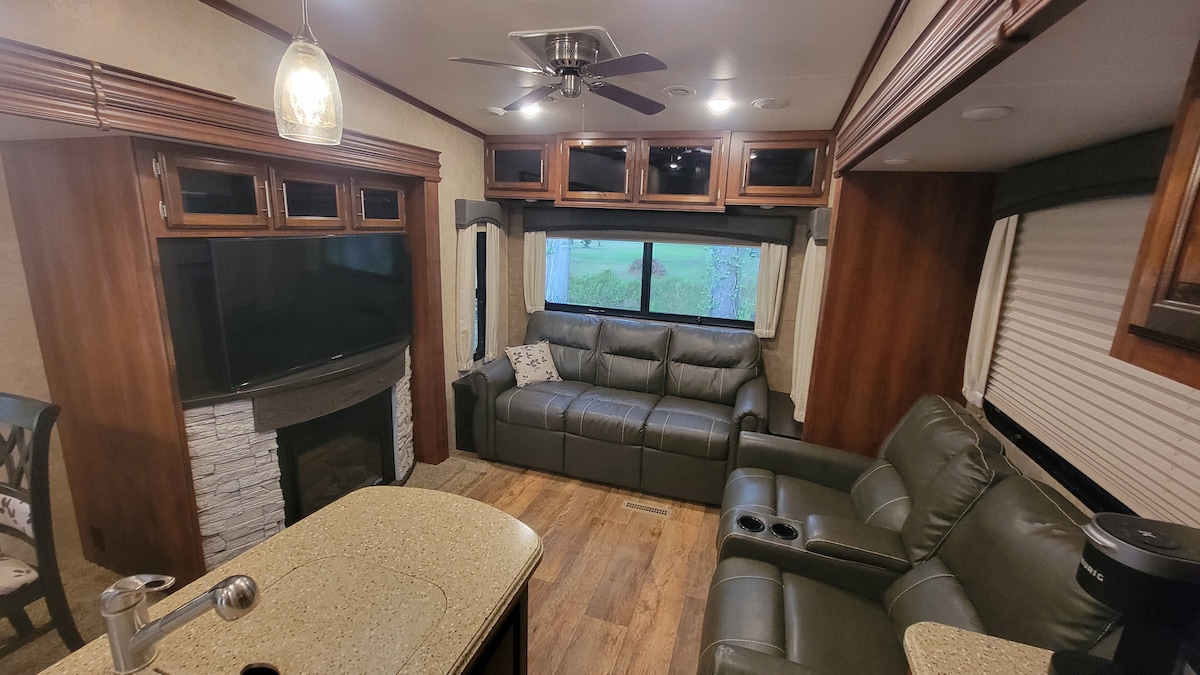 Pysy kaukana kaikesta, kun majoitut täydellisessä RR-glamping-paikassa! Shaded & private lot 138 has everything you need for your outdoor get away! Viidennen pyörän matkailuautossa on 4 vuodetta, ja siinä on jopa 7 vuodetta, joissa on 1 ja 1/2 kylpyhuonetta. The toy hauler room can be set as 2 queen bunks, 1 bed and a dining table or dining room. Siirrä hauskanpitoa ulkona omalla takalla, grillillä, lasisella nuotiopaikalla, paljon ulkoistuimia ja golfkärryä! PELASTUSTYÖNTEKIJÖIDEN, ARMEIJAN JA OPETTAJIEN VIESTI ENNEN 10%: N ALENNUKSEN VARAAMISTA!!!