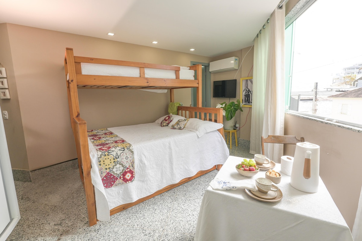 Huoneisto 204 Morubixaba-rakennuksessa – majoittumiskokemus, jossa on etuoikeutettu näkymä Iriri Beachille. Tämä toisessa kerroksessa sijaitseva huoneisto tarjoaa mukavuutta ja kätevyyttä modernissa ja kodikkaassa ympäristössä. Varustettu parivuoteella, ilmastoinnilla, älytelevisiolla vierastilassa, pienellä keittiöllä, jossa on mikroaaltouuni, minibaari ja ilmakeitin. Täydellinen paikka rentoutua ja nauttia Capixaban rannikon parhaista puolista vain muutaman askeleen päässä Areia Preta- ja Costa Azul -hiekkarannoilta.