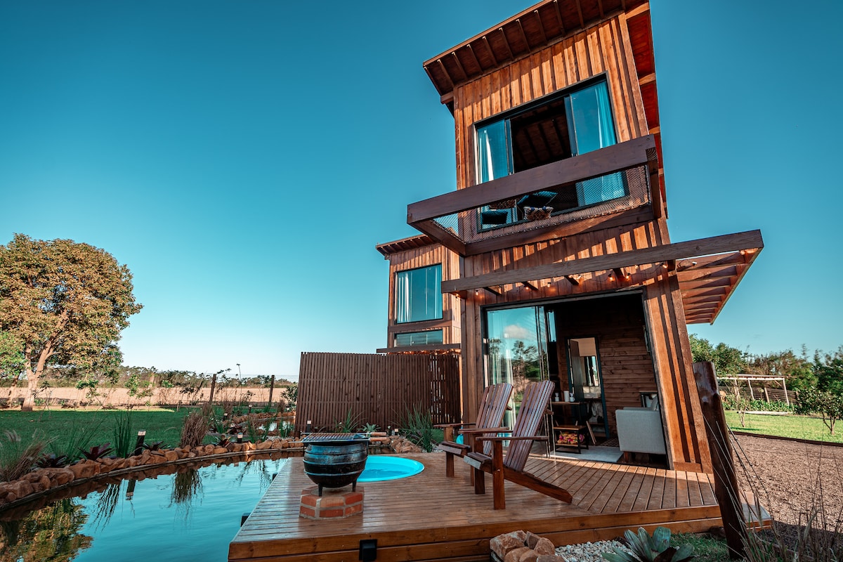 Ilmastoitu talo, jossa on 4 sviittiä lammen rannalla