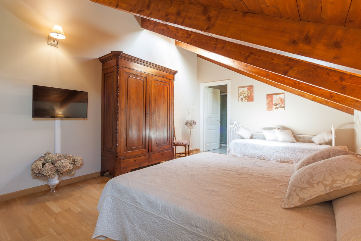 Olemme keskiaikaisen Nazzanon kylän juurella, Oltrepo Pavesen taianomaisten kukkuloiden keskellä, Rivan ja Salicen kylpylöiden välissä. 80 neliömetrin sviitti koostuu: makuuhuoneesta, jossa on parisänky, makuuhuoneesta, jossa on kaksi yhden hengen sänkyä, olohuoneesta, jossa on kaksi sohvaa, pöytä ja tuolit, sekä yksityisestä kylpyhuoneesta. Pyynnöstä voidaan lisätä lastensänky ja/tai vauvansänky. Sviitissä on kaksinkertaiset ikkunat, hyttysverkot, minibaari ja aamiaisnurkka. Erillinen sisäänkäynti uima-altaan edessä yksinomaiseen käyttöön. Upea näkymä.