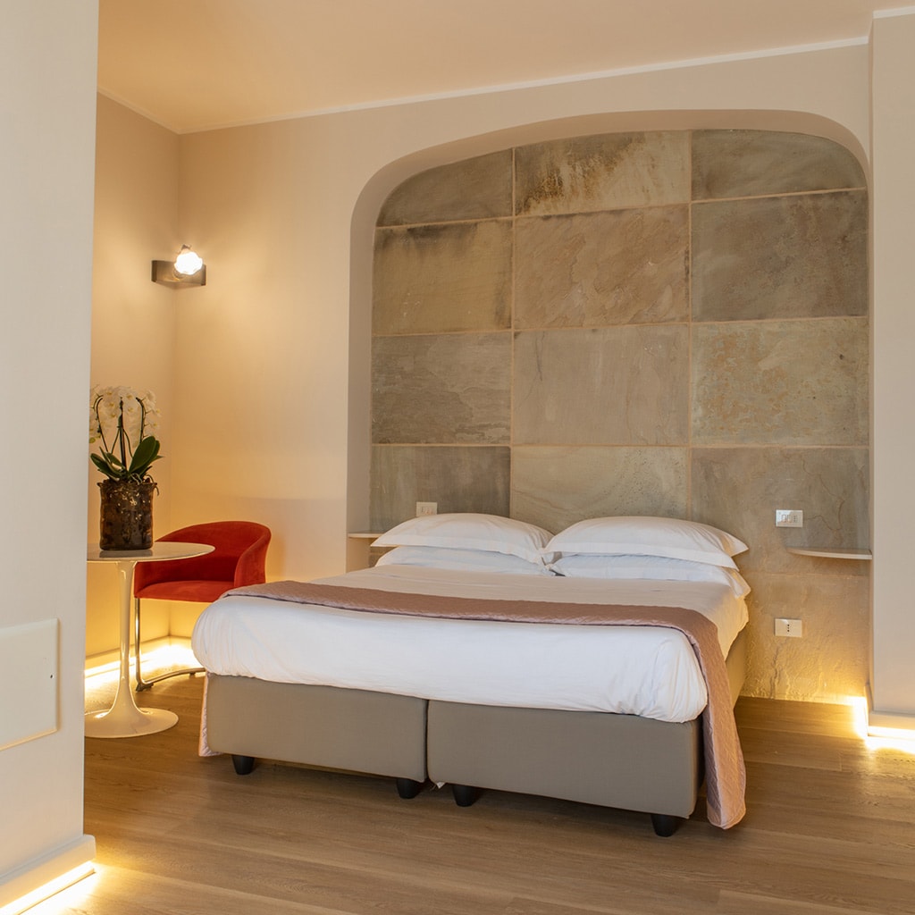 Matrimoniale ampia e luminosa, con balcone affacciato sul cuore della città. Soffitti in legno e finiture di design completano l’atmosfera accogliente ed elegante