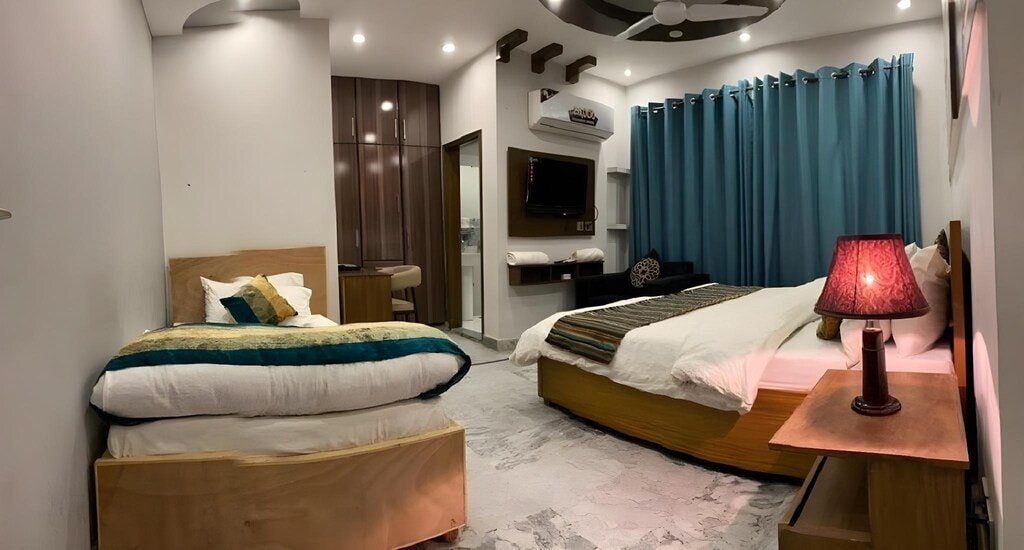 Step into refined comfort. Our Boutique Luxe Suite blends soft aesthetics, warm lighting, and timeless design — all at Kashmir Point, right on Main Bank Road. Enjoy 24/7 housekeeping, secure parking, a rooftop live BBQ, and an intimate private cinema under the stars. With a restaurant on the top floor, every moment feels curated, cozy, and beautifully luxurious.