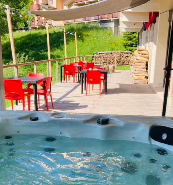 Viehättävä mökki, jossa on poreallas ja ravintola.