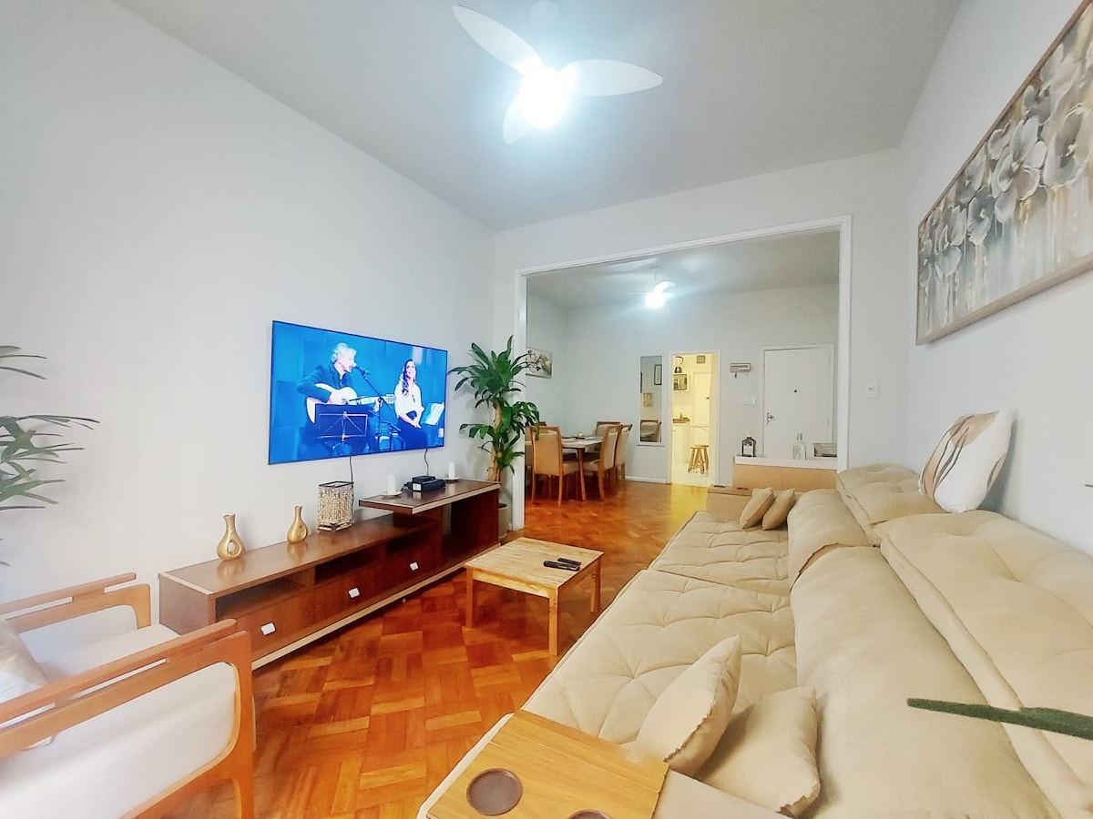 Rakennusmääräysten mukainen huoneisto enintään 6 hengelle, 3 minuutin päässä Copacabana-rannalta, post 6, jossa on 3 makuuhuonetta, 2 kylpyhuonetta, keittiö, ilmastointi ja keskitetty lämmin vesi. Osittainen merinäkymä. 4 kaapelitelevisiota + wifi ja Netflix Apartamento para um máximo de 6 pessoas, de acordo com os regulamentos de construção, a 3 minutos da praia de Copacabana, posto 6, com 3 quartos, 2 banheiros, cozinha, ar condicionado e central de água quente. Sala de estar, sala de jantar e varanda. 4 TV + WIFI