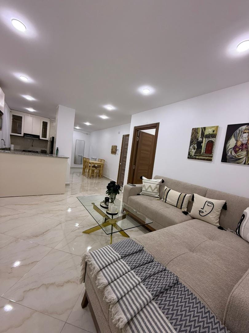 66 m2:n F3-huoneisto, jossa on kaikki mukavuudet, rauhallinen ja valoisa, kokonaan kunnostettu ja puulattiat. Epätyypillinen ja käsityöläinen sisustus. Asunto koostuu seuraavista: • Olohuone, jossa on keittiö • Olohuone (kulmasohva ja TV) • 2 makuuhuonetta (parivuode ja kerrossänky, ulosvedettävä sänky ja vauvansänky) • 2 ilmastointilaitetta • WiFi, juomavesi ja vuodevaatteet Modernissa "Ryad city III" -asuntokompleksissa, jossa on turvallinen sisäänkäynti (kulkulupa, kamera ja vartija), 5. kerroksessa, hissillä, moskeija asuinkompleksin alapuolella
