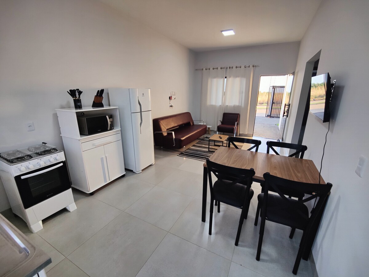 Apartamento completo, moderno e extremamente confortável. • Suíte aconchegante com ar-condicionado, TV, roupa de cama e guarda-roupa • Banheiro com box, amenities de banho, toalhas • Wi-Fi e espaço para trabalho ou estudos • Cozinha equipada • Internet • Câmera de segurança externas • Ambiente reservado • Estacionamento individual e privado com acesso direto à rua ⛔ Proibido animais de estimação 🚭 Proibido Fumar Relaxe e desfrute de um lugar amplo, seguro e perfeito para descansar.