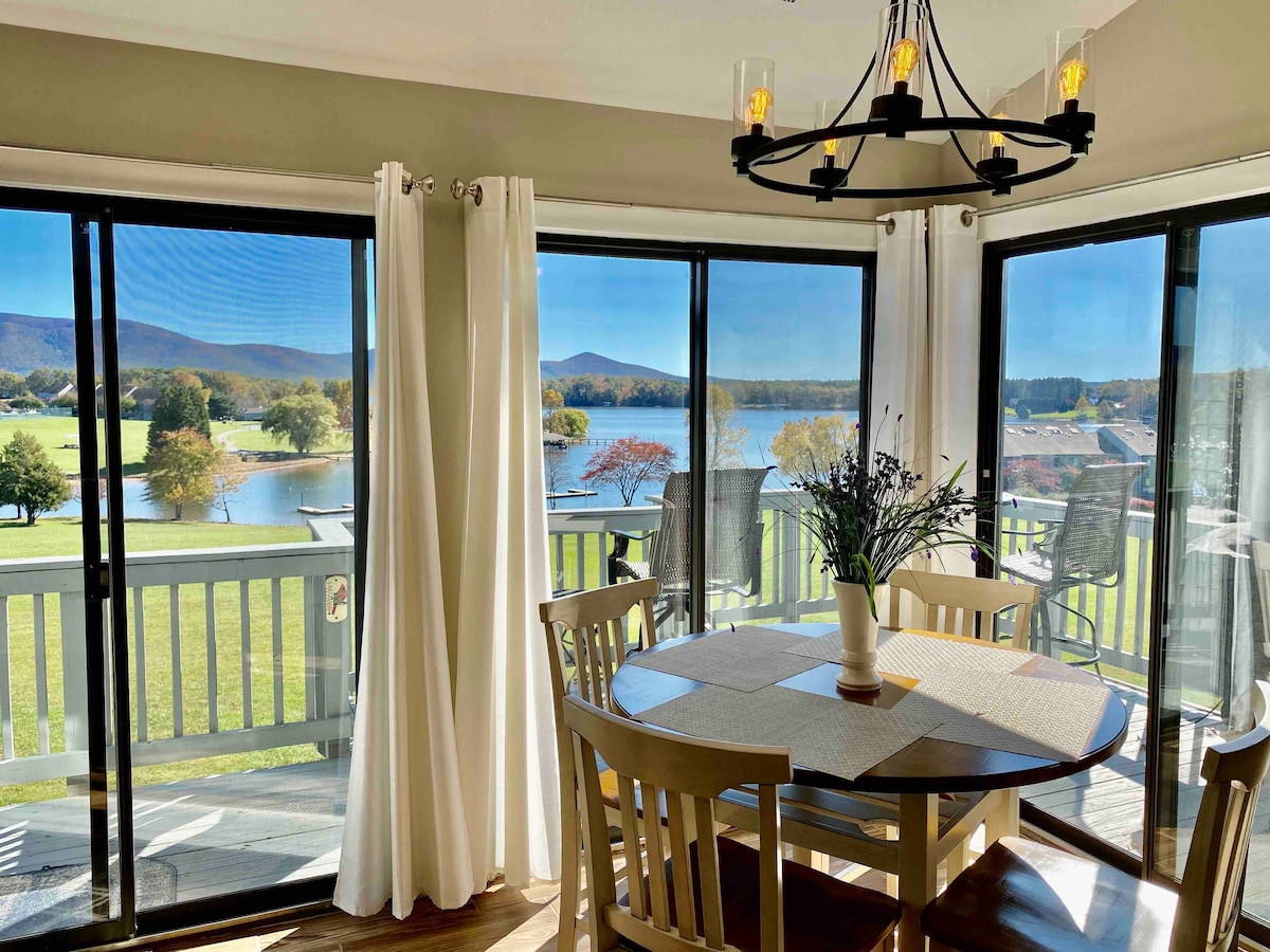 Fantastinen lomakohde kauniilla Smith Mountain Lake -järvellä! Nauti upeista maisemista tämän ylimmän kerroksen kulmahuoneiston molemmilta puolilta. Huoneistossa on ympäröivä terassi ja luonnollista varjoa. Se on täydellinen rentouttavaan lomaan tai seikkailuun! Aktiviteetteihin kuuluvat veneily (vieraslaitureilla), uinti (sisä- ja ulkouinti), pickleball, kuntoilu ja rentoutuminen porealtaassa, höyrysaunassa tai saunassa! Jos työskentelet etänä, tässä hiljaisessa tilassa on työpöytä ja nopea langaton internetyhteys. Yksittäisessä LVI-yksikössä on myös UV-valo.