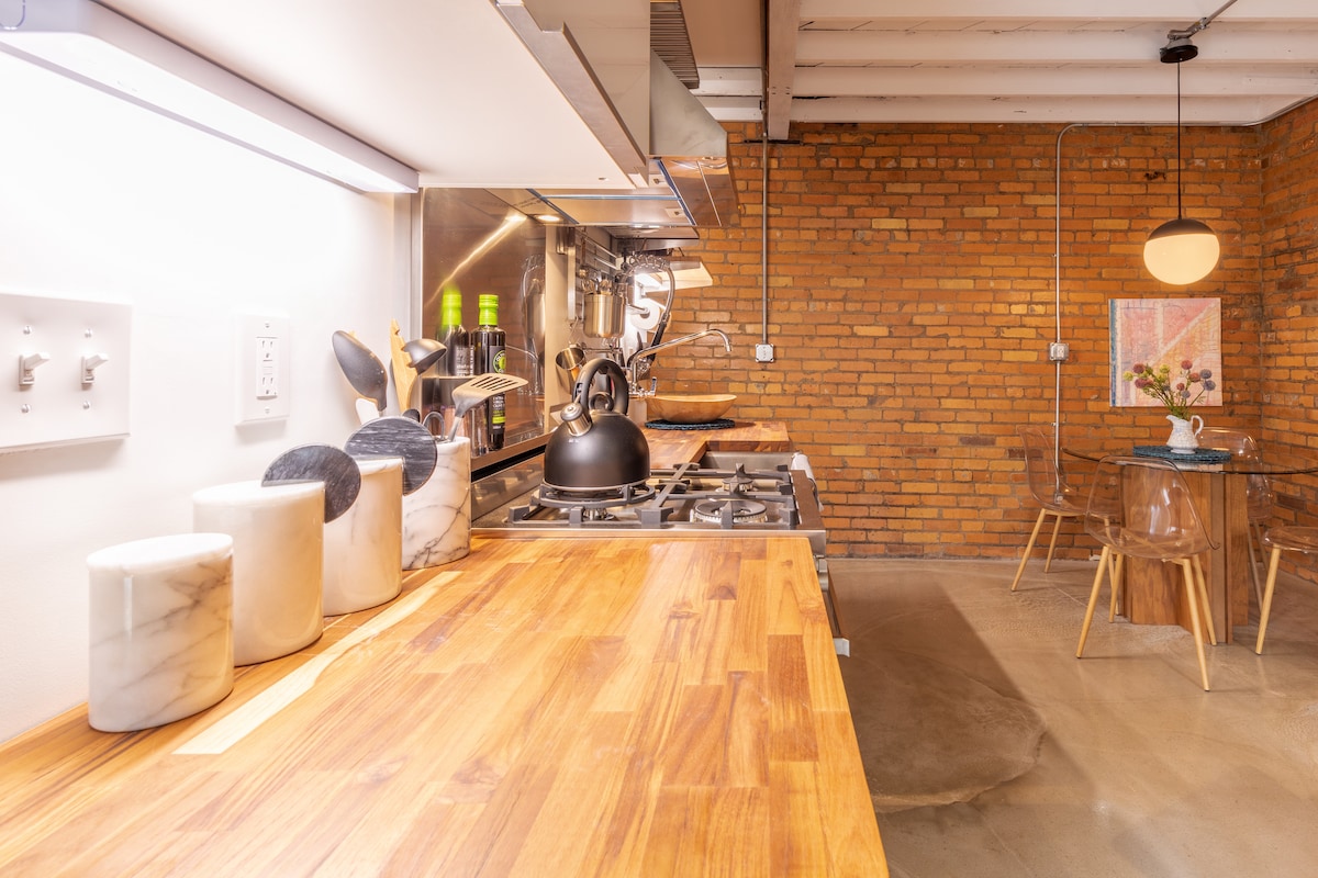 *Lyhytaikaiset majoitukset ja erikoishinnat saatavilla tammi–maaliskuussa* Tervetuloa valoisaan ja tyylikkääseen loftiin, jossa on paljaita tiiliä, korkeat ikkunat ja kodikkaita 1950-luvun yksityiskohtia. Nauti luonnonvalosta, mukavista istumapaikoista ja rauhallisesta retriitistä kaupungin sydämessä. Täydellinen rentoutumiseen, työskentelyyn tai lyhyeen lomaan.